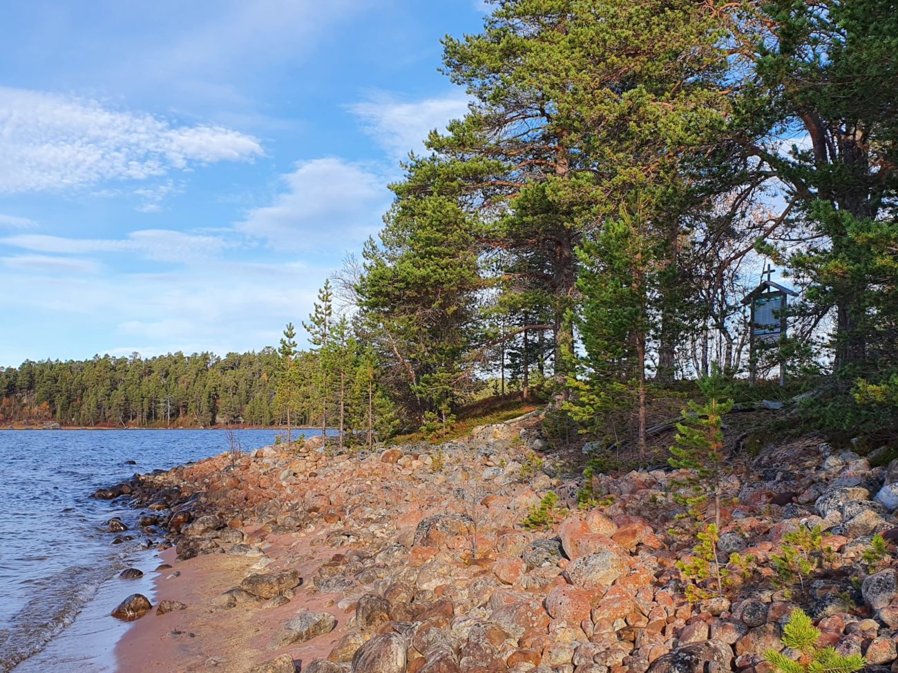 Vanha hautuumaasaari ranta mäntyjä järven vesi sininen taivas