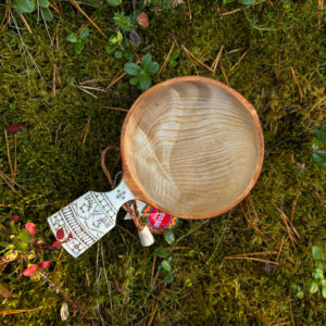 • Päältä kuvattu kuksa, jossa kahvassa kuvioitu poronsarvilyöte