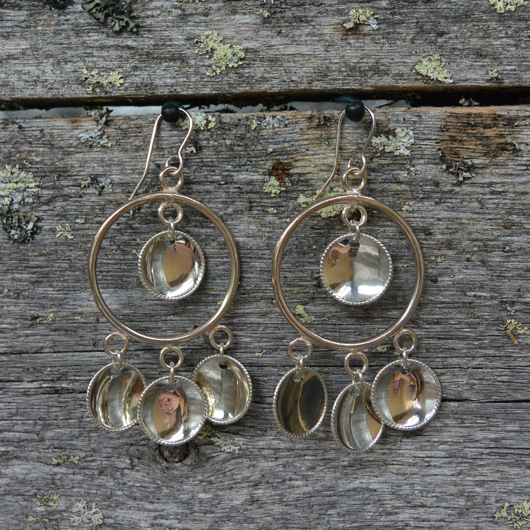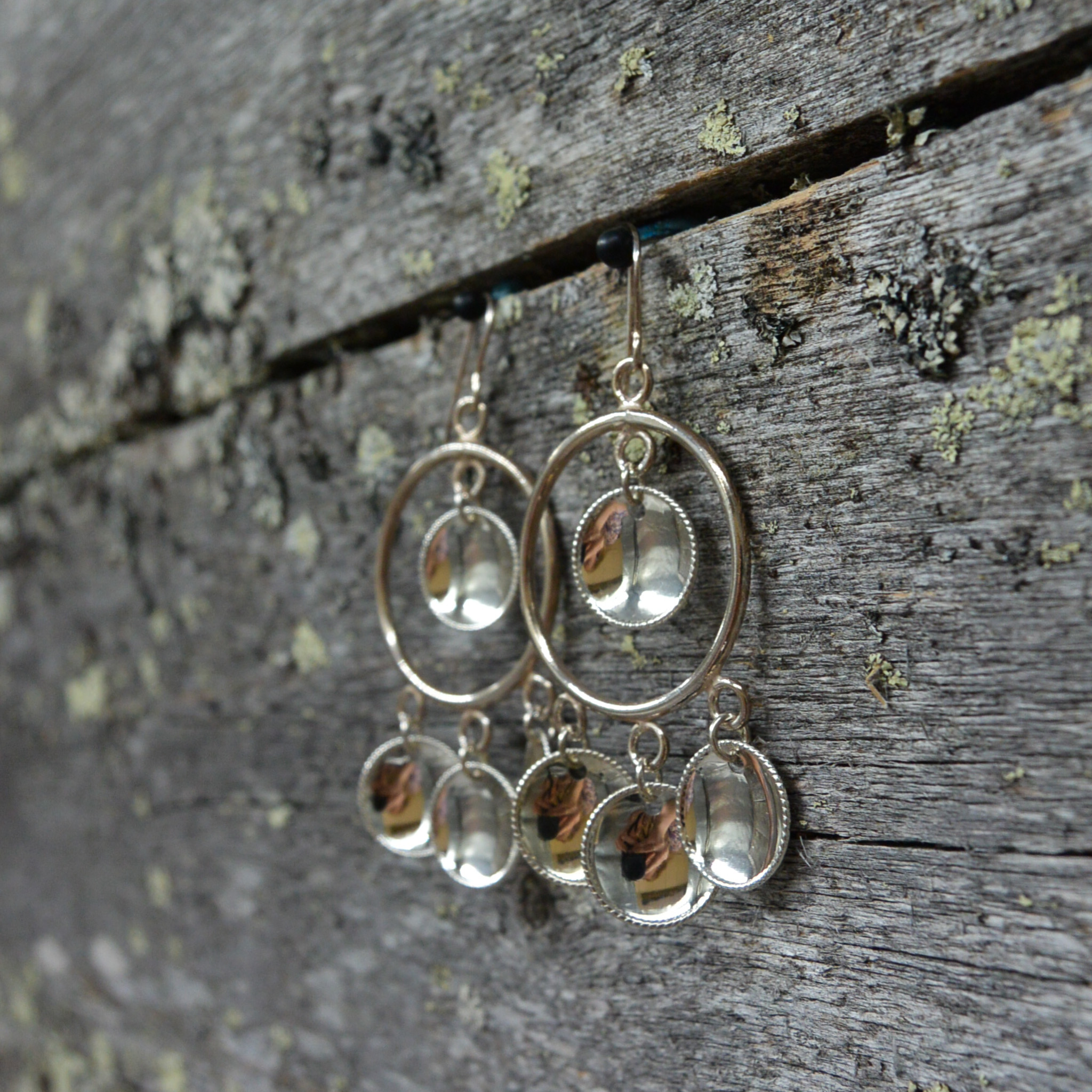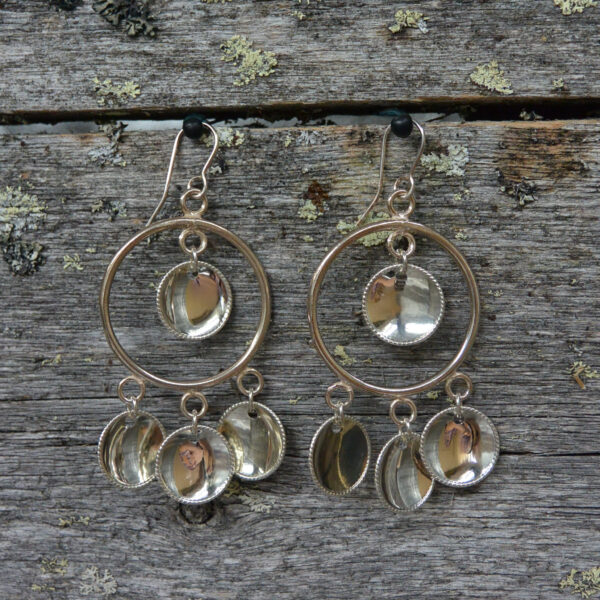 Katja Maggan suunnittelemissa, näyttävissä korvakoruissa hopeaympyrään kiinnitetyt laukkaset välkehtivät kauniisti auringossa.