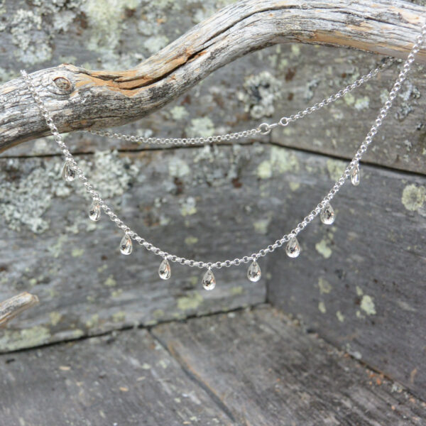 Elegantti hopea kaulakoru. Katja Maggan suunnitteleman Bálggis-Polku -korusarjan kaulariipus, jossa 9 hopeista pisaralaukkasta.