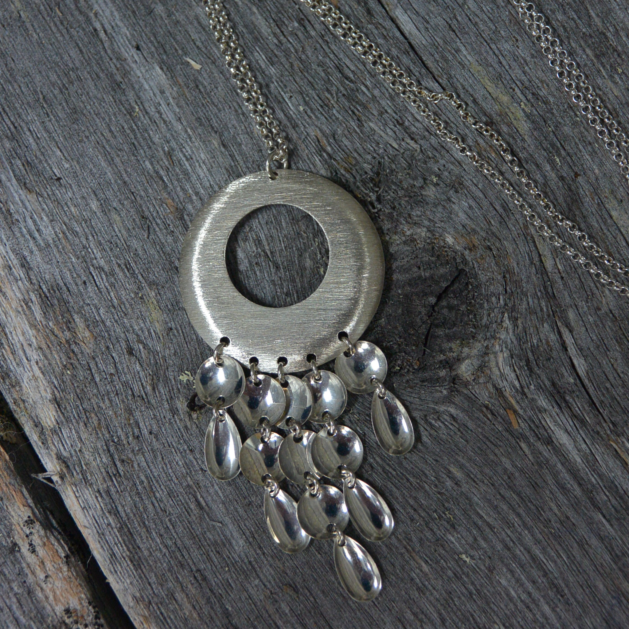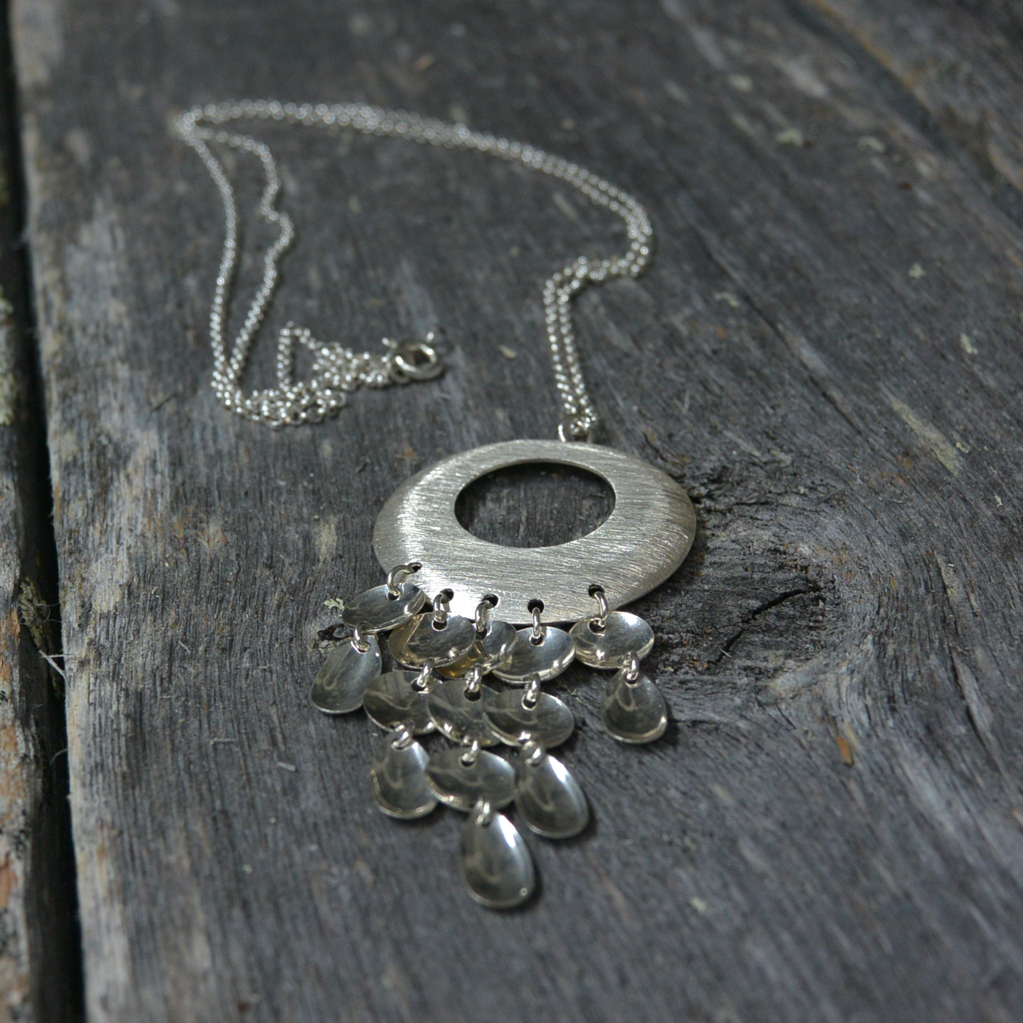 Iso hopeinen kaulakoru laukkasilla ja pitkällä hopeaketjulla.
