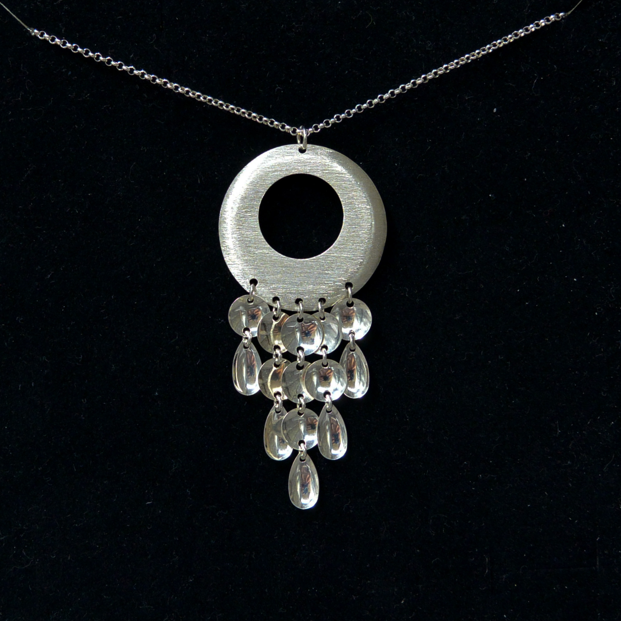 Katja Maggan suunnittelema näyttävä hopeakaulakoru tulee varmasti huomatuksi. Korun suuri rengas on hopeaa, jonka pinta on harjattu.
