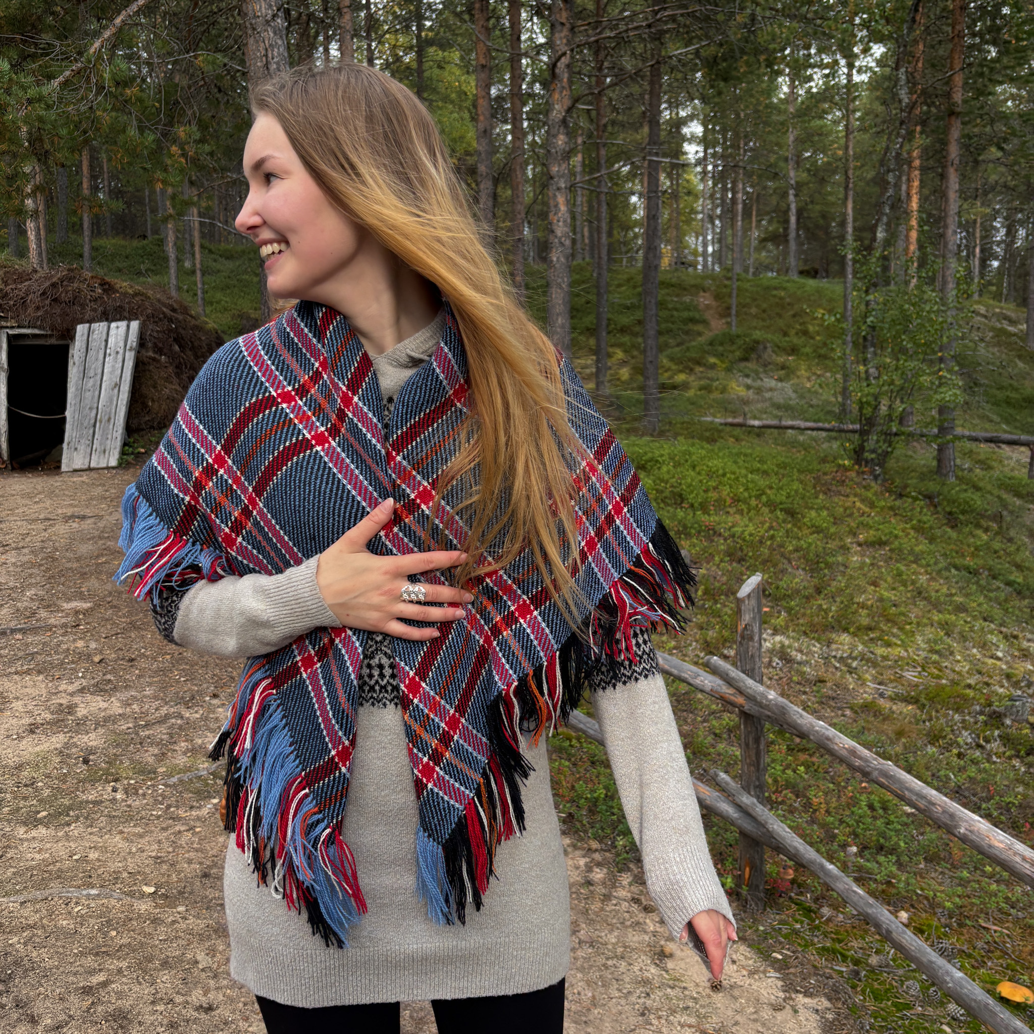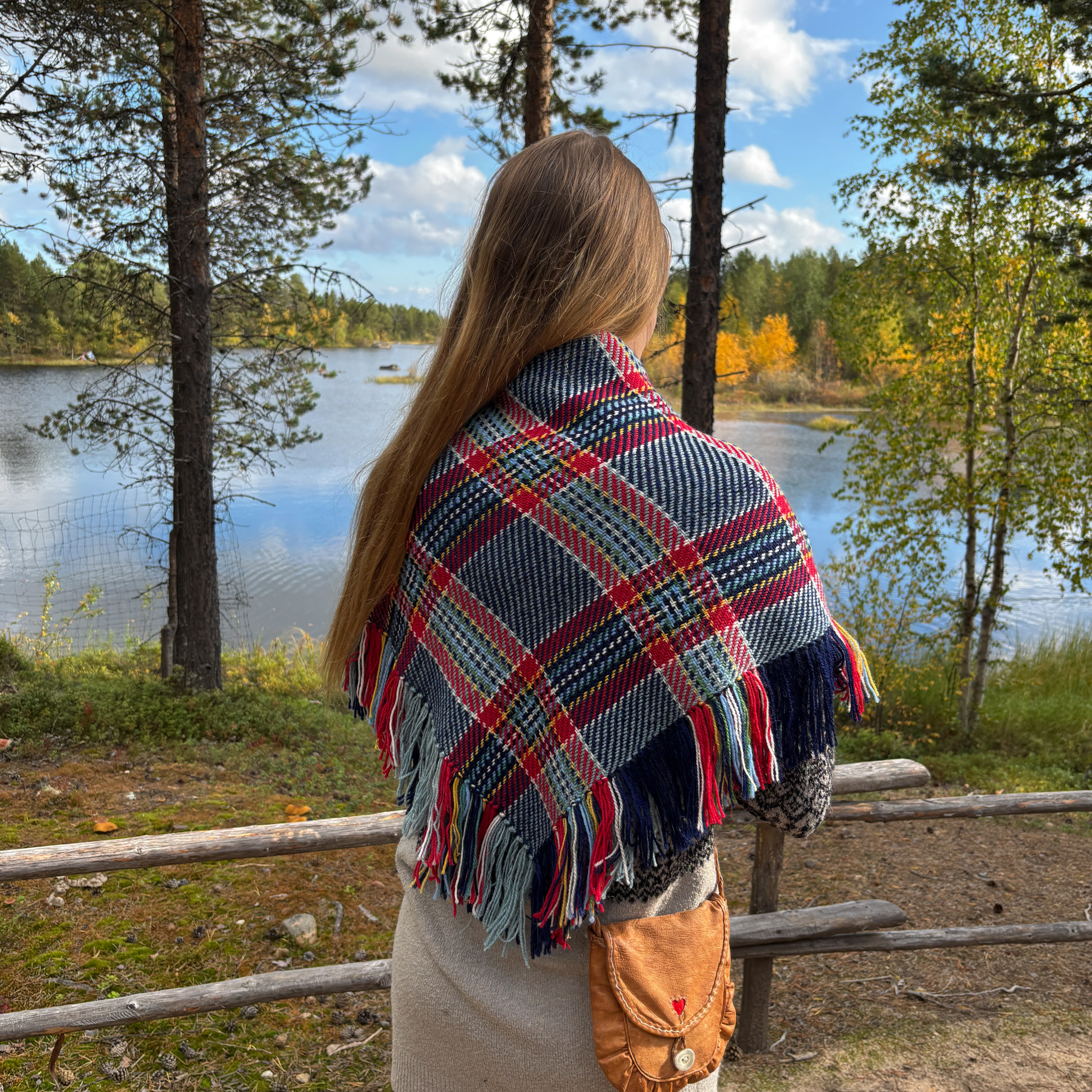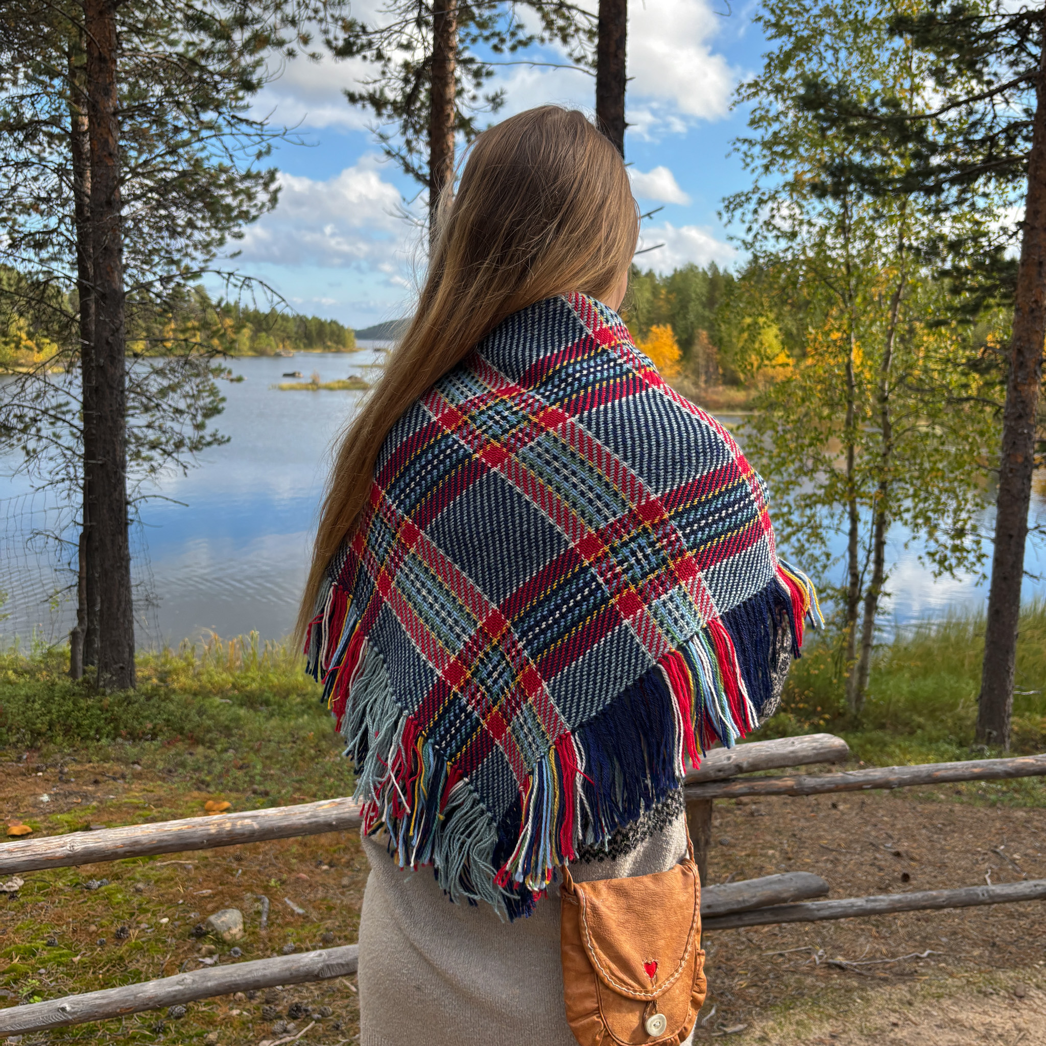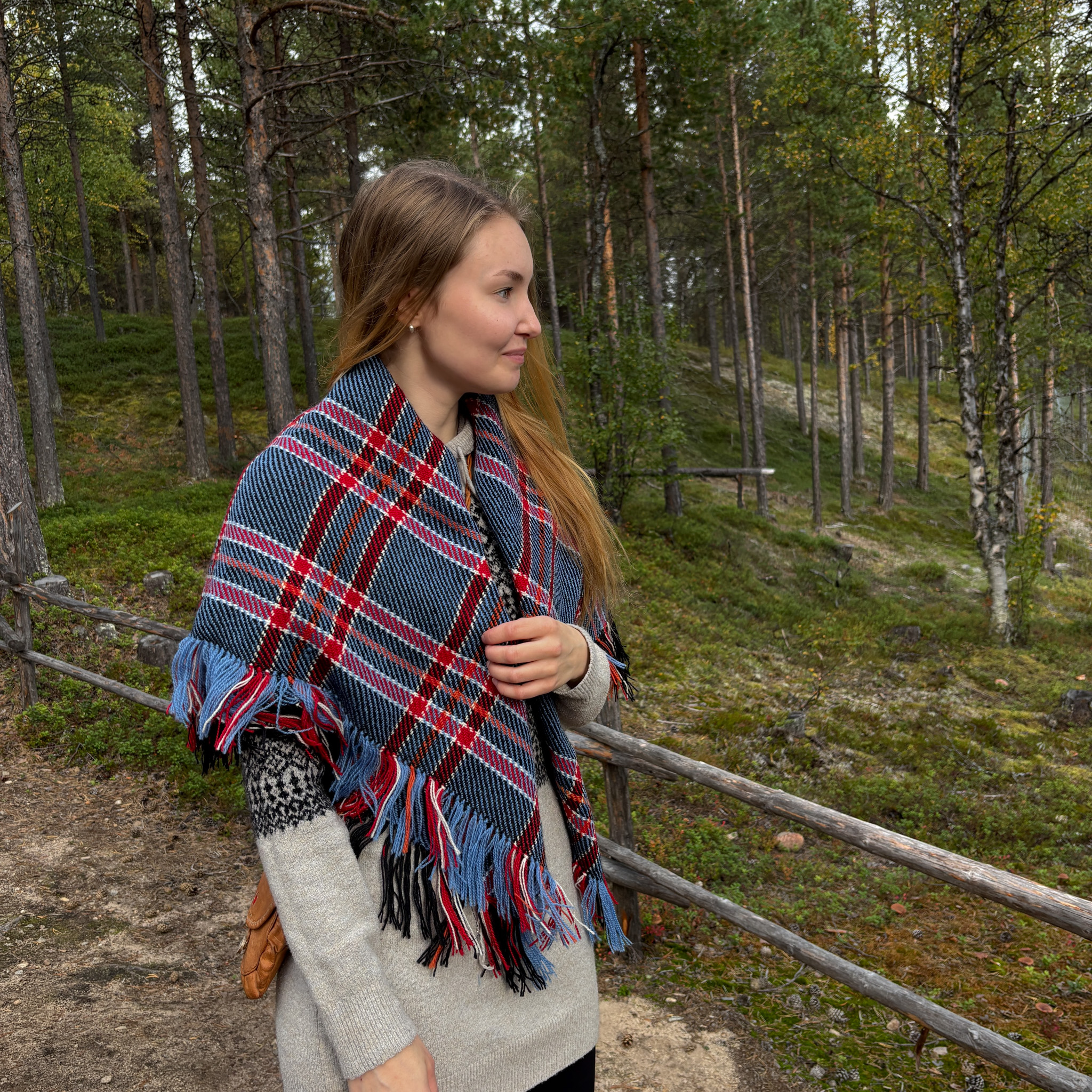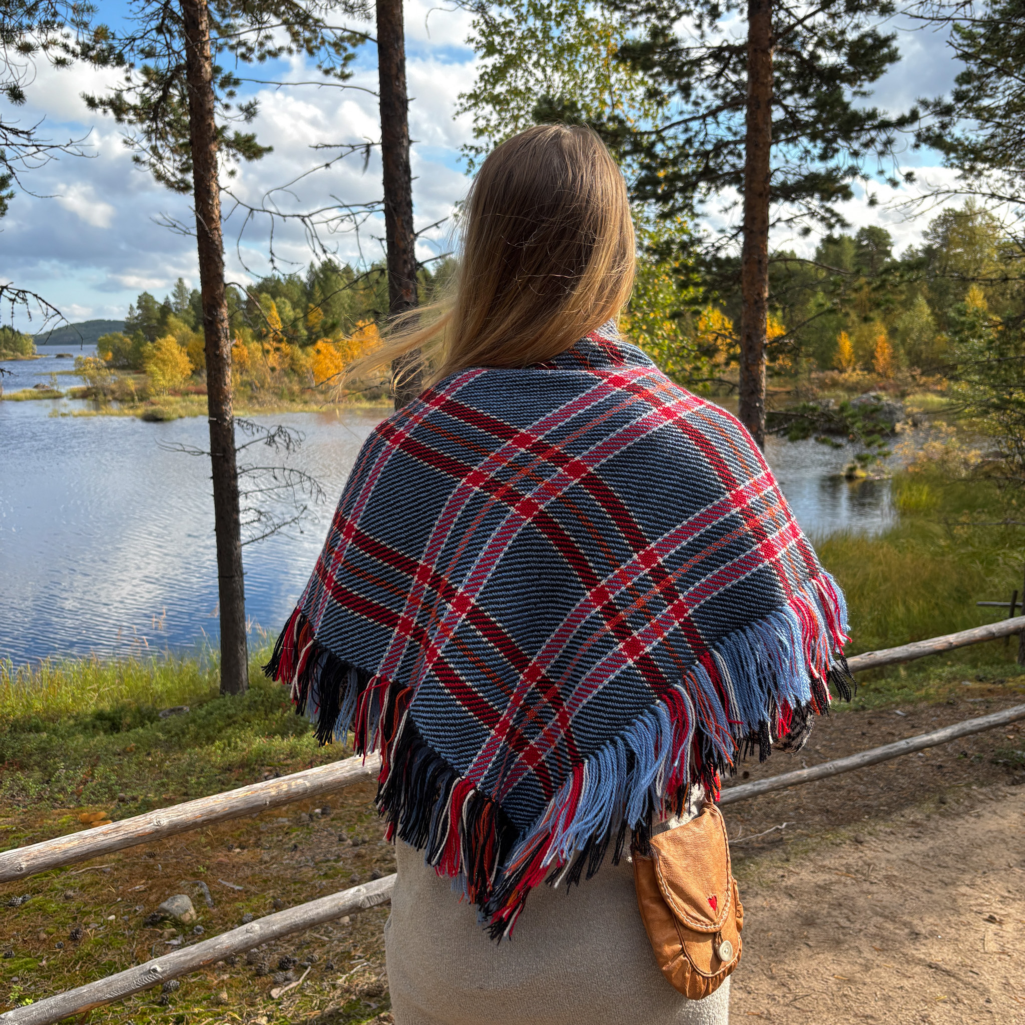 Huivin on kutonut paikallinen käsityöläinen, Ellen Haarahiltunen kotonaan, Inarissa.