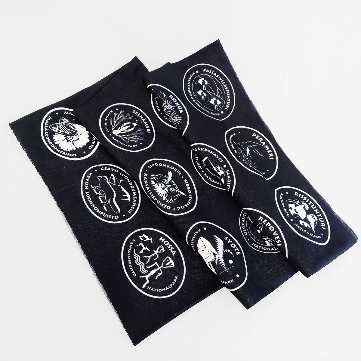 Kansallispuisto tuubihuivi. Värit: punainen, vihreä ja musta.