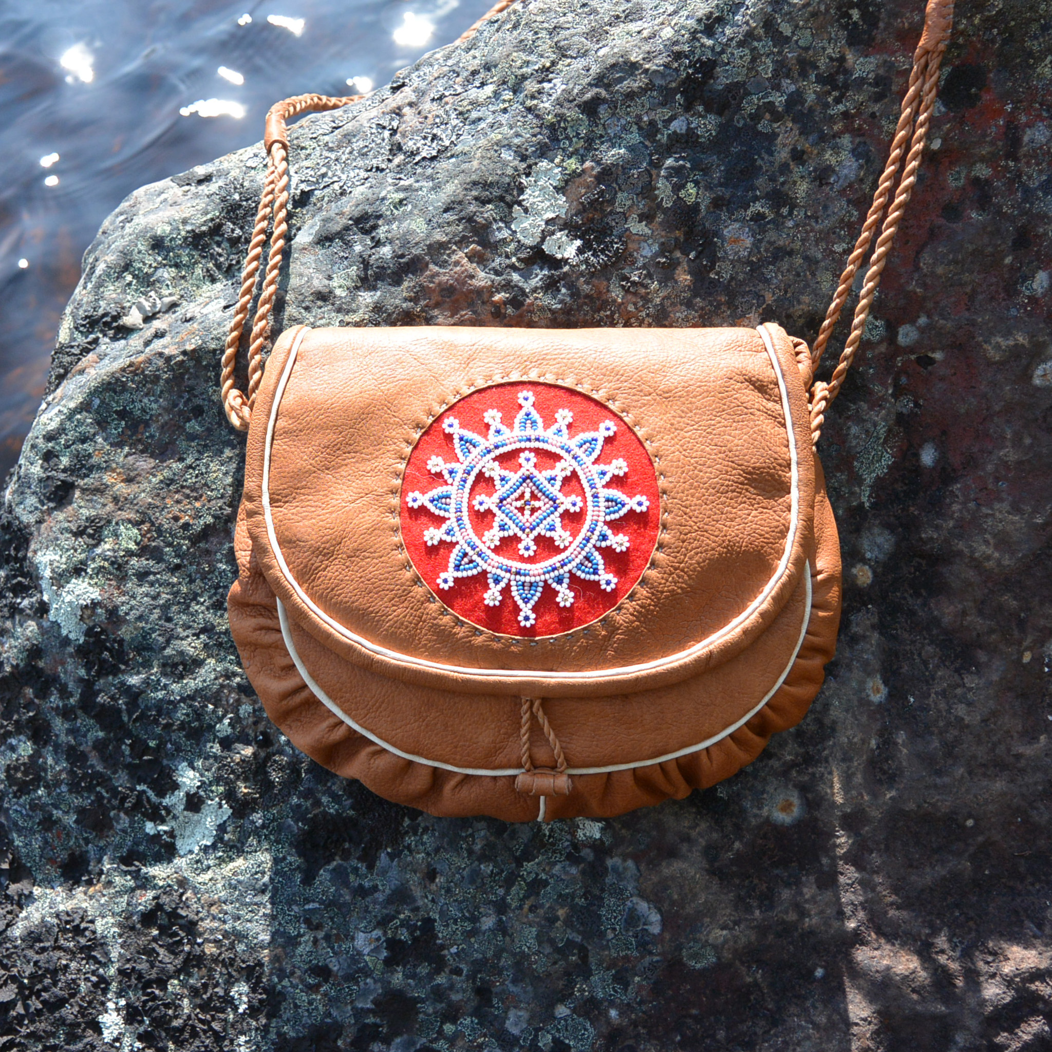 Laukku on helmikuviointia myöten käsin ommeltu ja nahka on itse käsin parkittu.