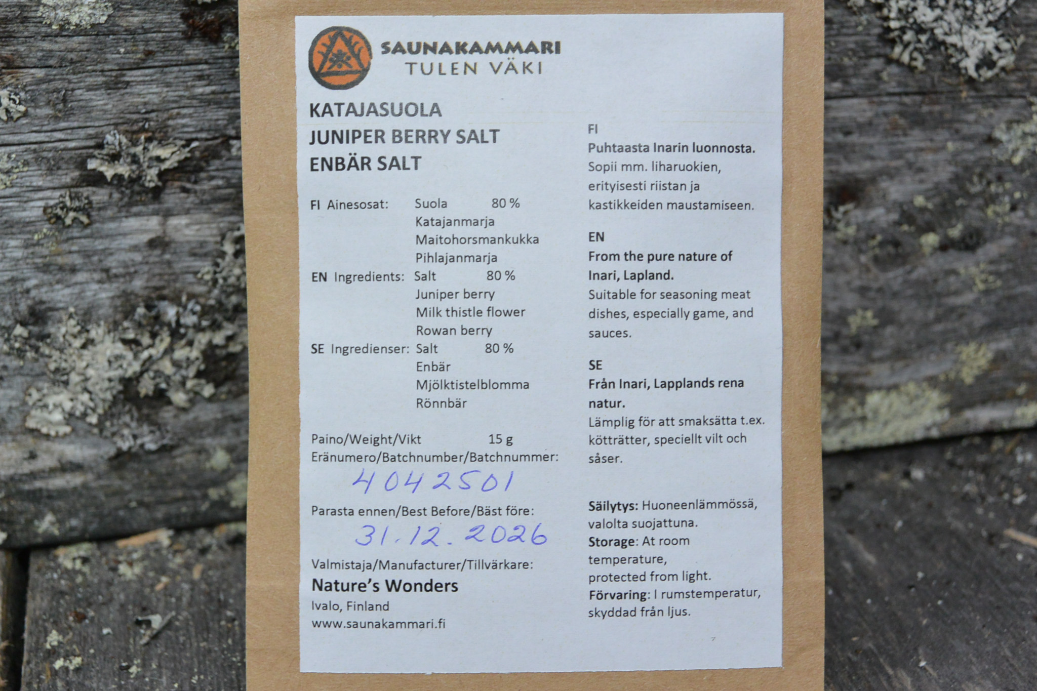 Ainesosat: suola 80%, katajanmarja, maitohorsmankukka, pihlajanmarja