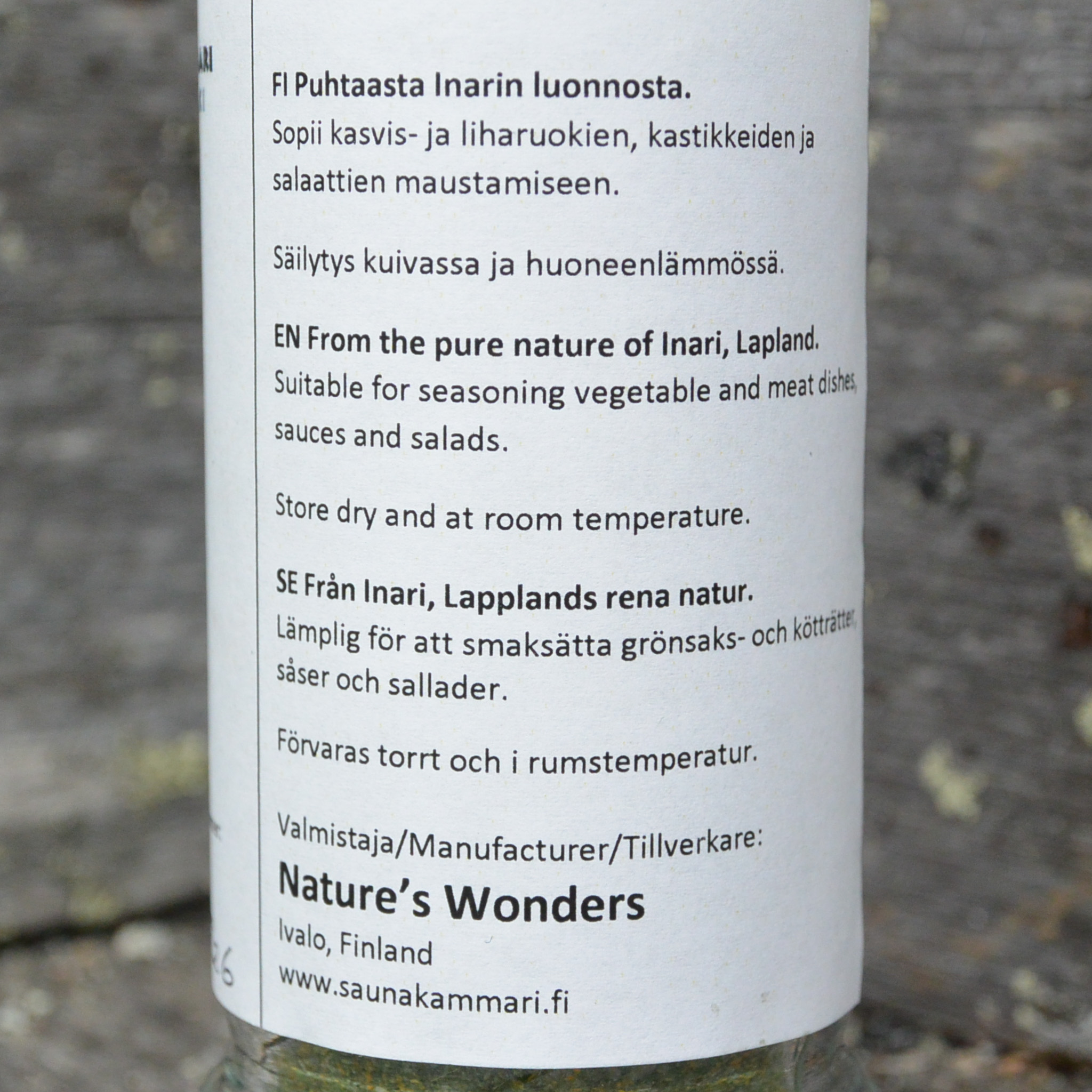 Puhtaasta Inarin luonnosta. Sopii kasvis- ja liharuokien, kastikkeiden ja salaattien maustamiseen.