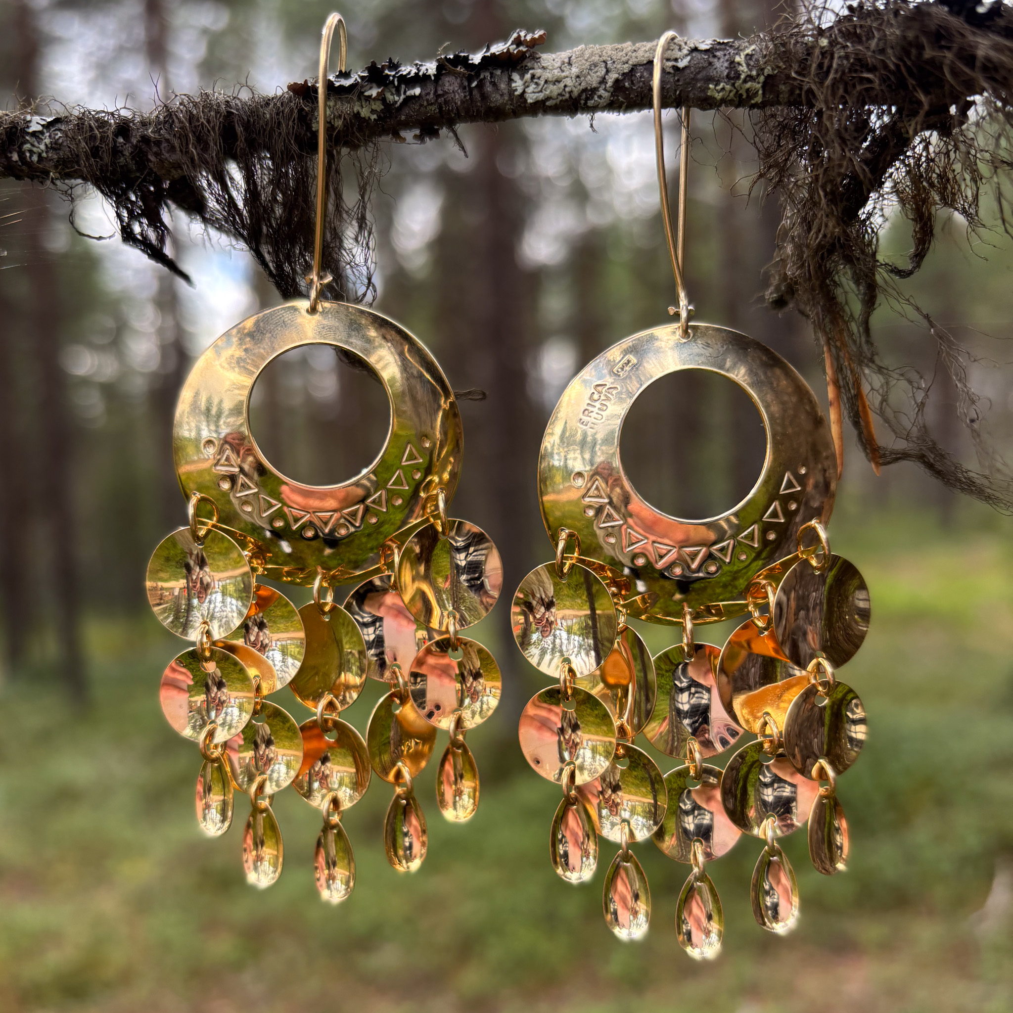 Upeat Erica Huuva Designin kullatut korvakorut. Nämä suuret ja juhalliset korvakorut eivät jää huomaamatta. Ne ovat saaneet inspiraationsa perinteisestä hopeasta, jota käytetään saamenpuvun kanssa.