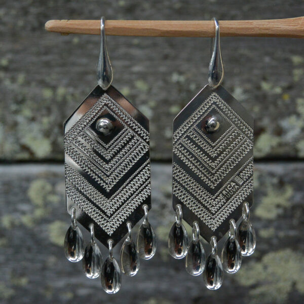 Rátnu / Rana -korvakorut Erica Huuvalta. Taidokkaasti käsin kaiverretut korvakorut on viimeistelty kauniisti helisevillä hopealaukkasilla.