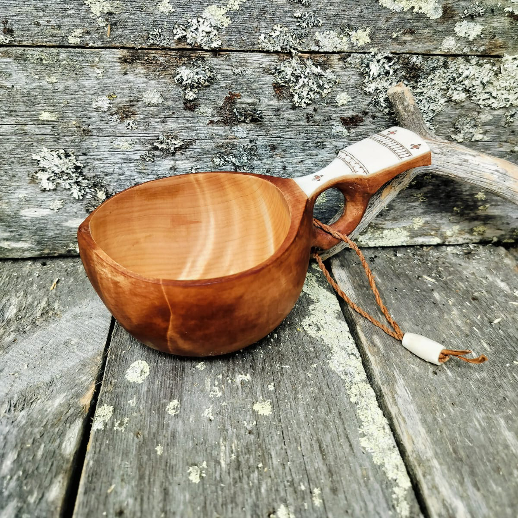 Tämä kuksa on taidokasta saamenkäsityötä. Sen pahka on tunturipahkaa Karigasniemi-Kaamasmukka alueelta.