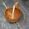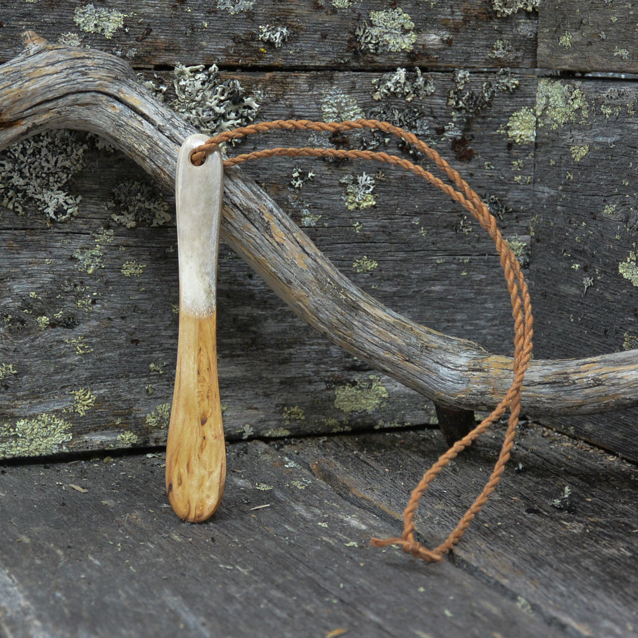Heikki Ranttilan Inarissa käsin visakoivusta ja poron sarvesta valmistettu kuksalusikka. Lusikalle on tehty lenkki sisnasta eli poron parkitusta nahasta, joka mahdollistaa kiinnityksen esimerkiksi kuksan kahvaan.