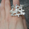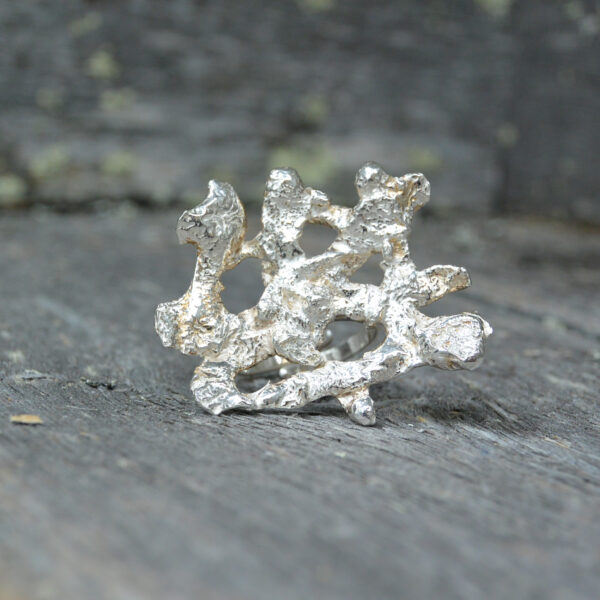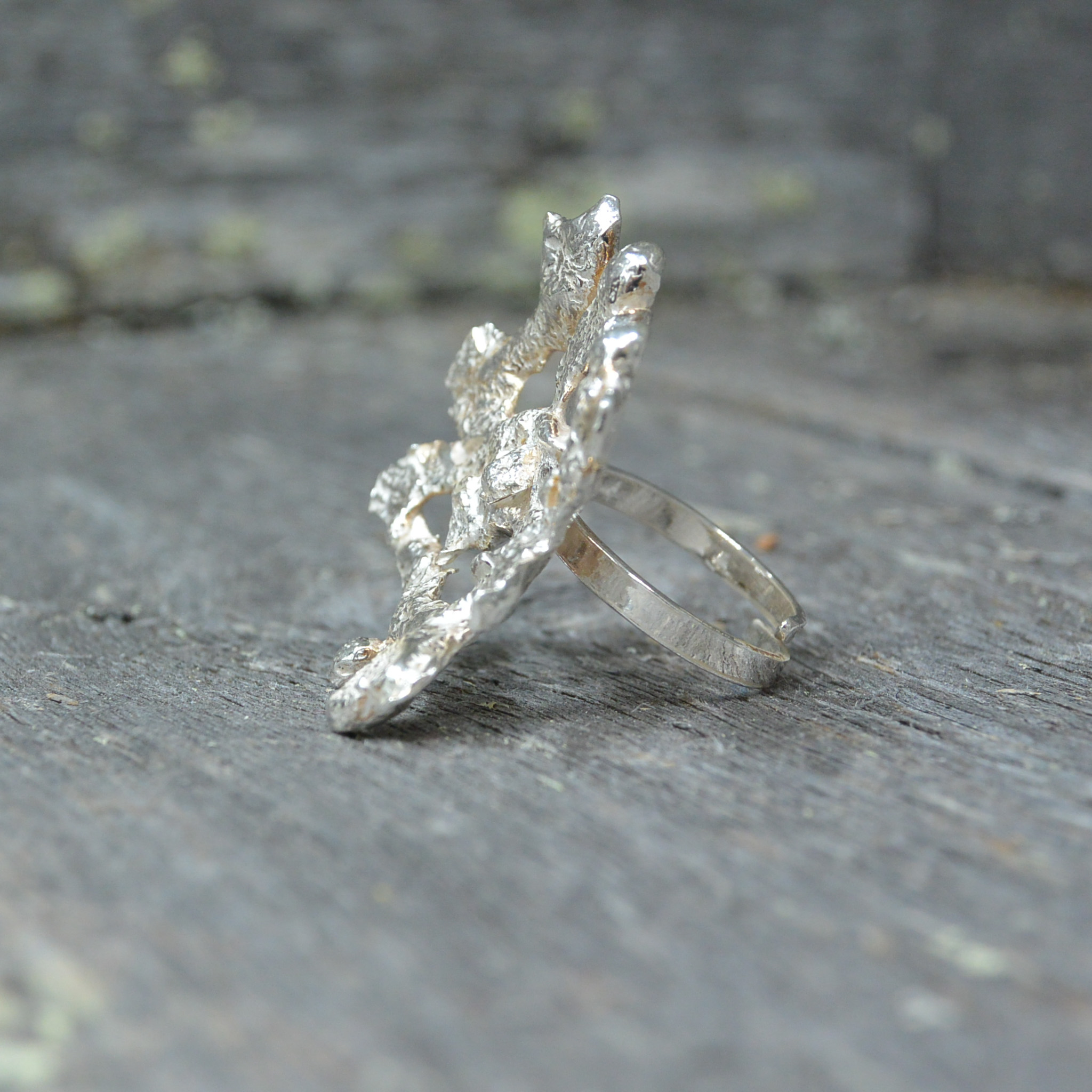 Suuri hopeinen sormus. Valuhopeassa orgaanisen rouhea pinta.