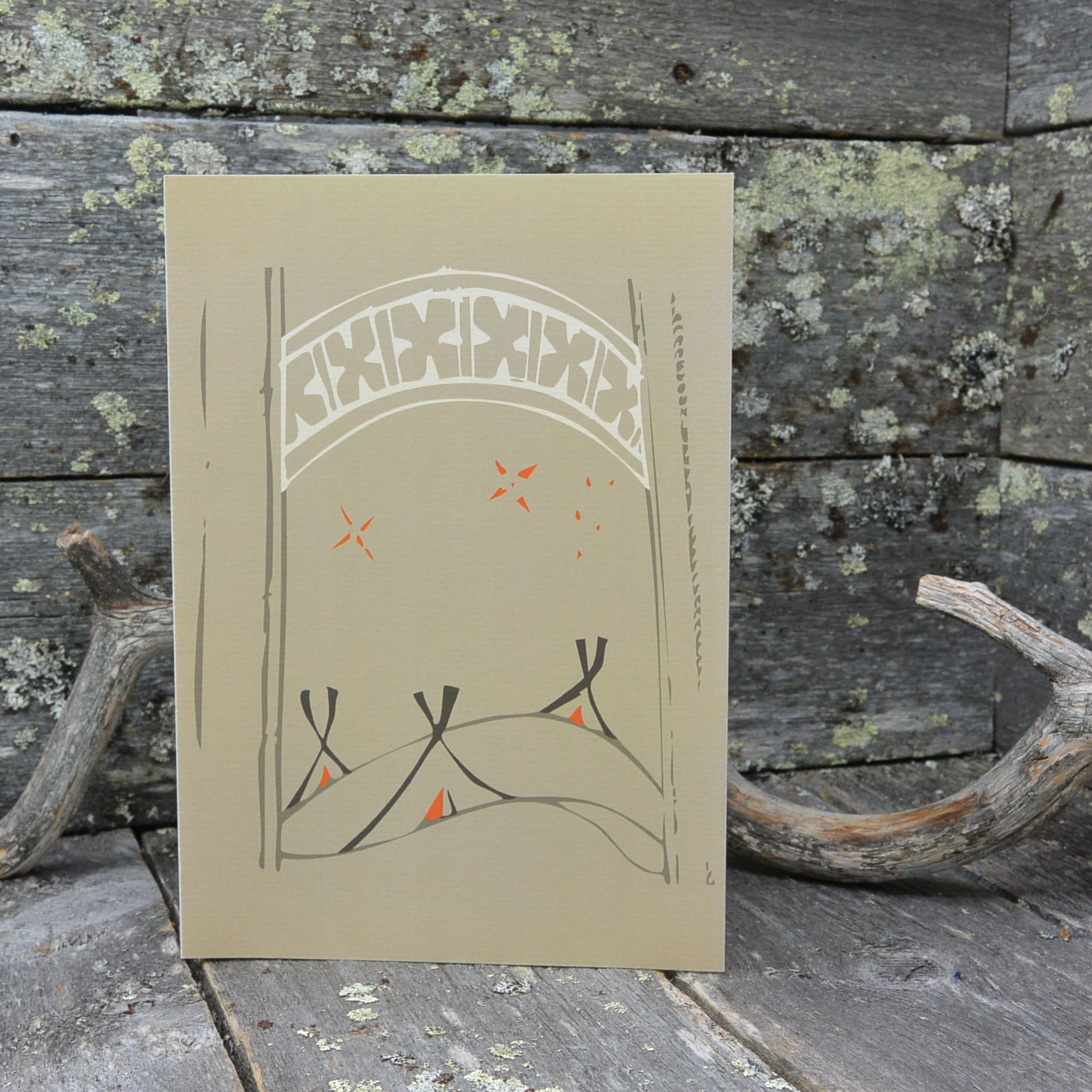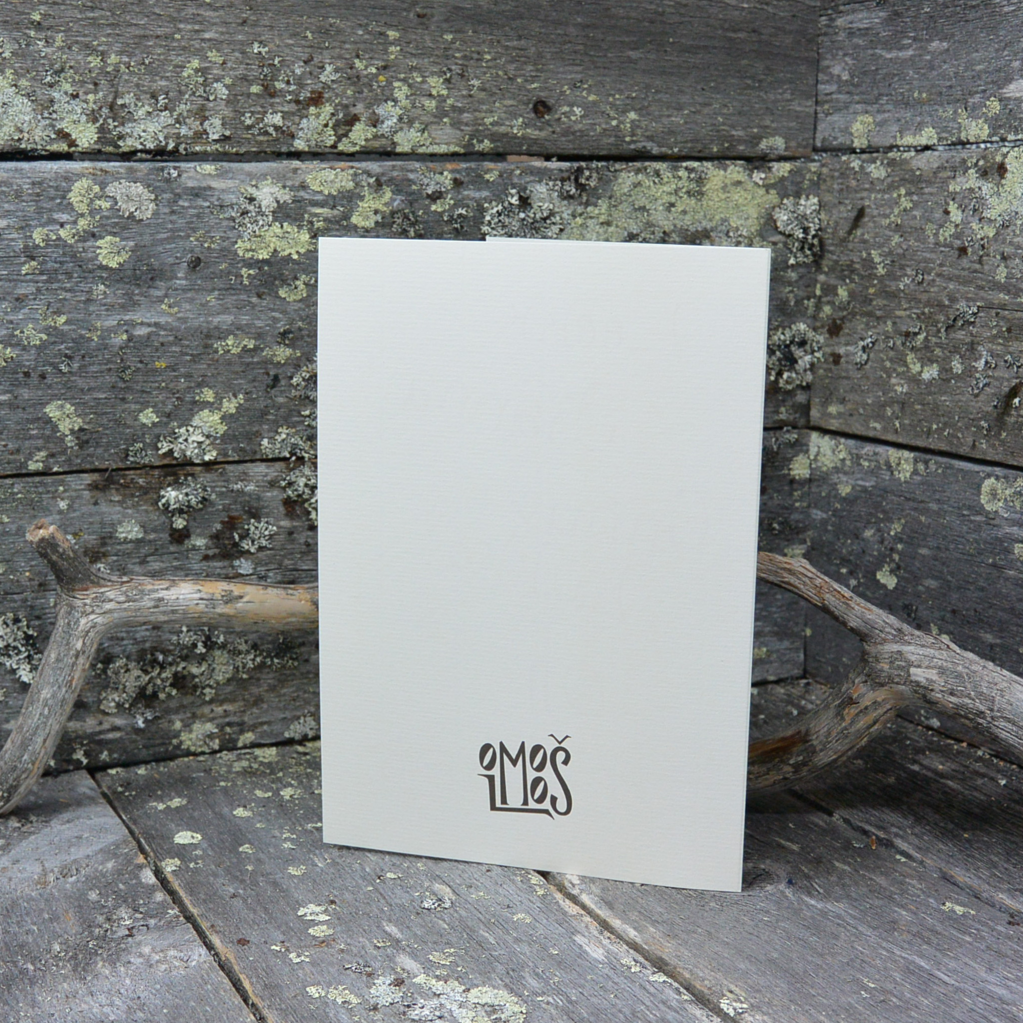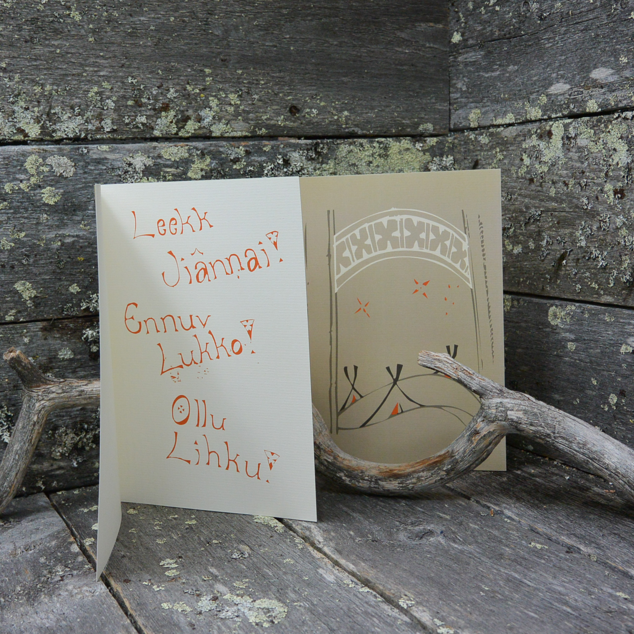 Kaksiosaisen onnittelukortin on suunnitellut Saamelaisalueen koulutuskeskuksessa (SAKK) Inarissa opiskeleva Okko Kausalainen osana kurssia, jossa opiskelijat suunnittelivat tuotteita myyntiin Siida Shopiin.