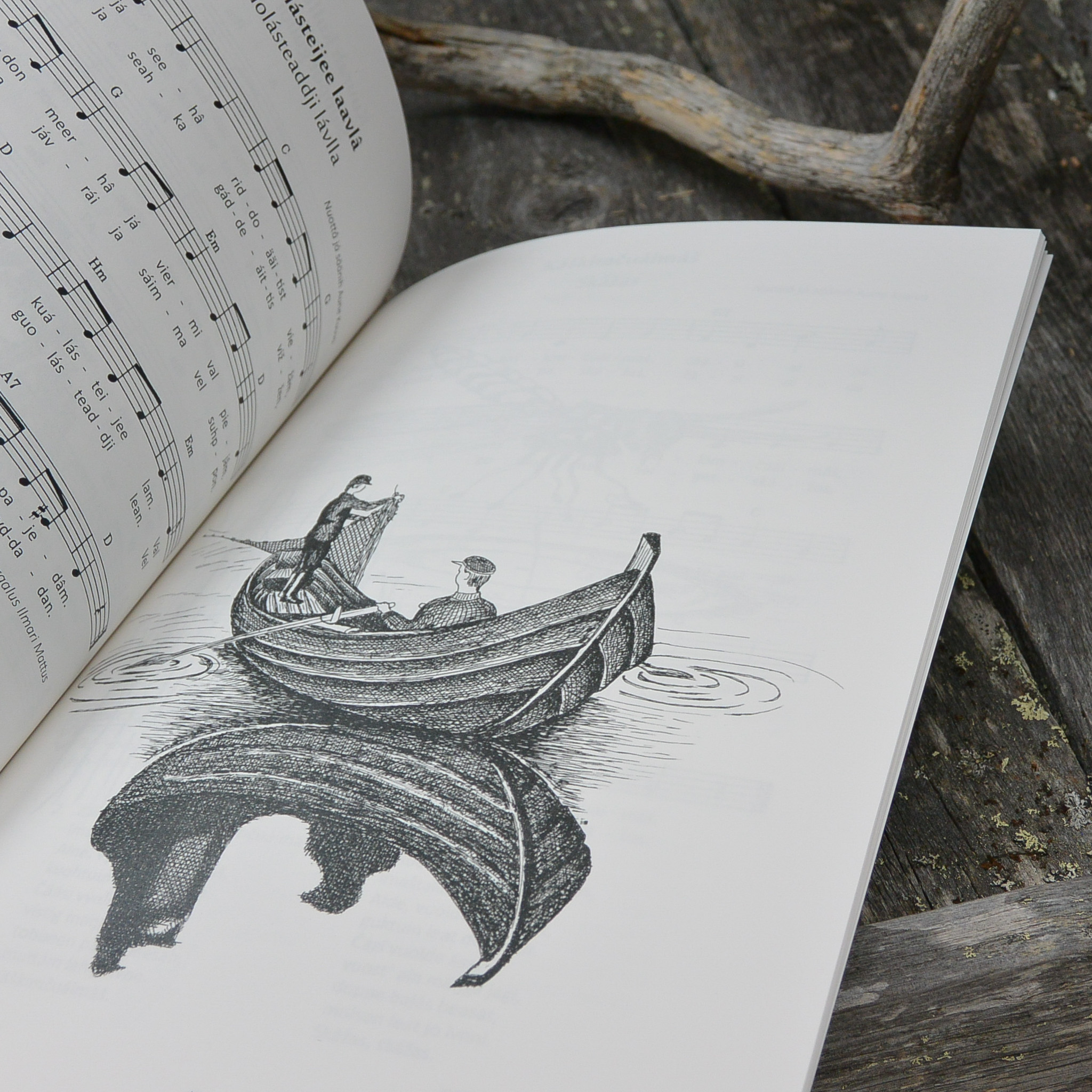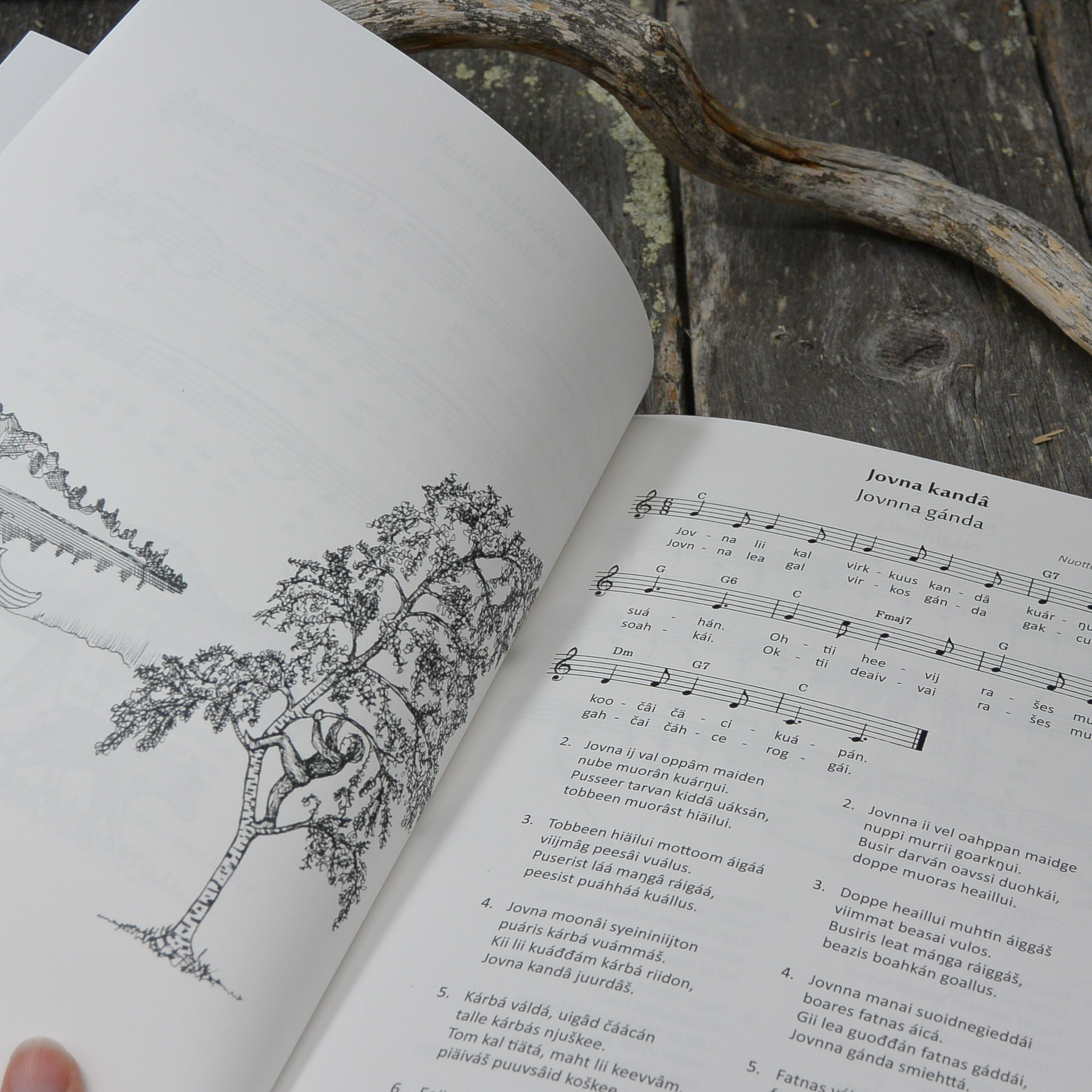 Lasten laulukirja inarin- ja pohjoissaamen kielillä. Nuotit Helena Hyvärinen, Anna Lumikivi (uudet laulut s. 56-58) Kuvitus, taitto ja pohjoissaamenkieliset sanat Ilmari Mattus