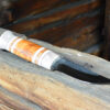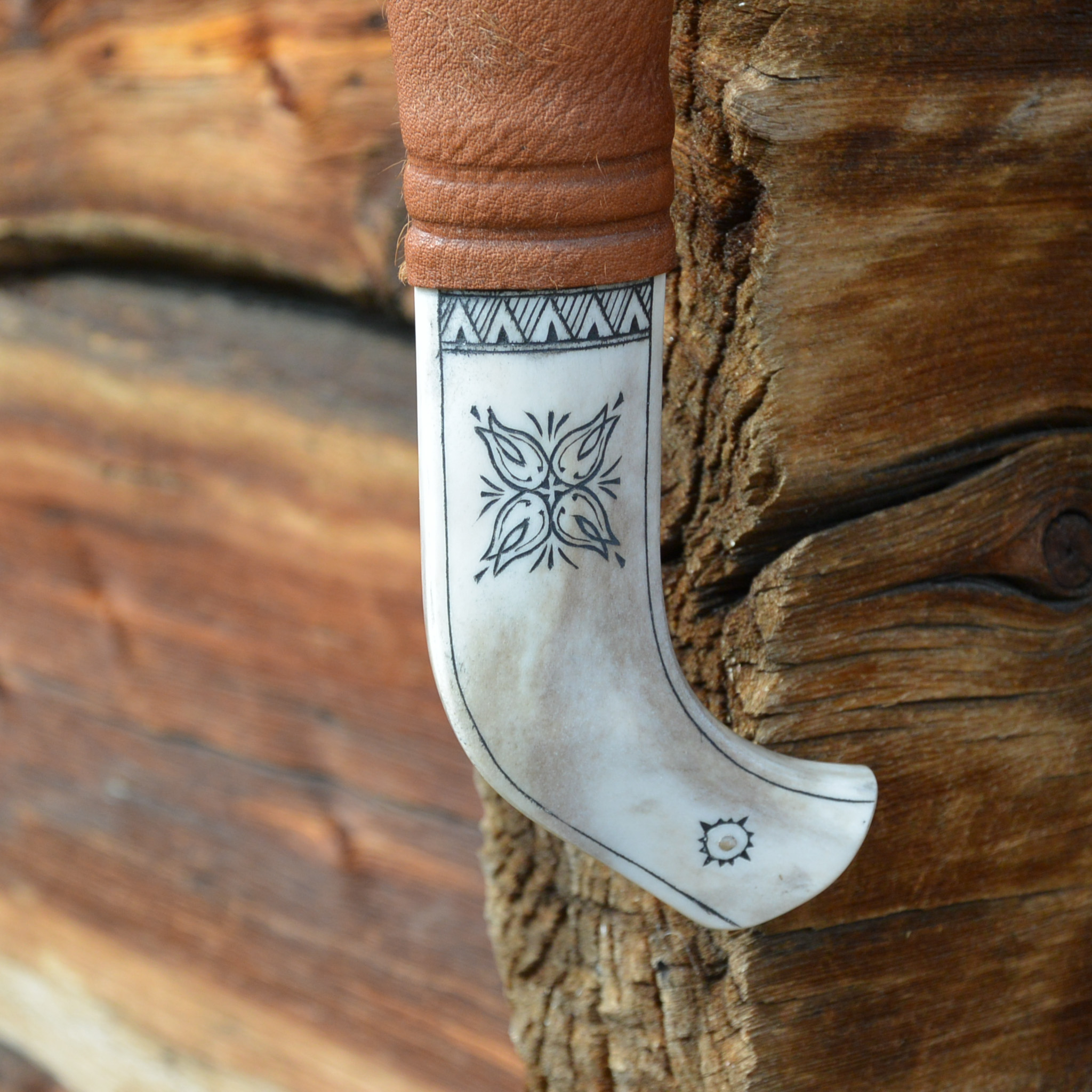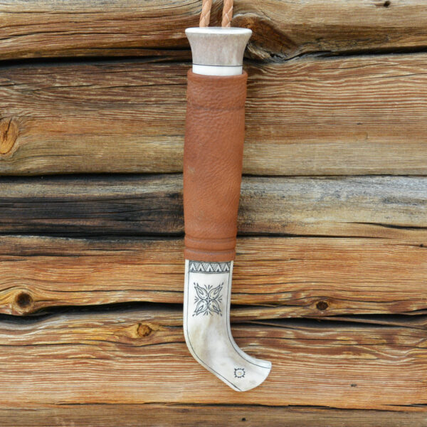 Materiaalit: poronsarvi, visakoivu, hiiliteräs (takoja Toivo Jaaranen), sisnanahkainen nyöri ja poronsarvinappi, tuppi käsinmuokattua vasikannahkaa, hopeaniitti.