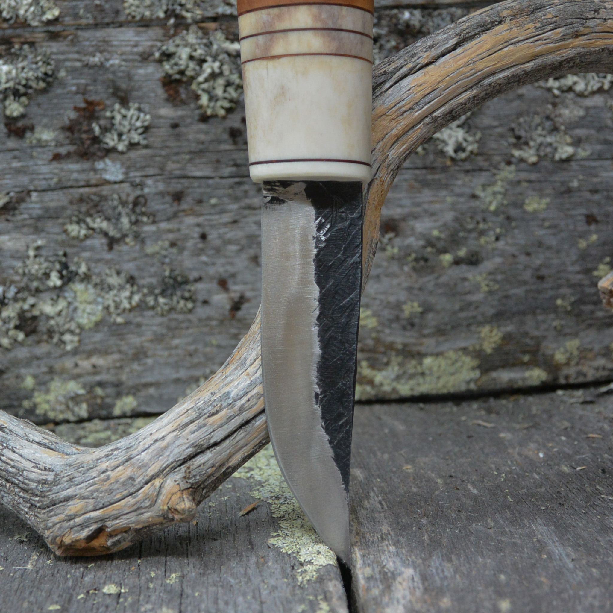Tämän puukon terä on hiiliterästä, 85 mm. Terän on valmistanut Topi Jaaranen.