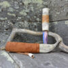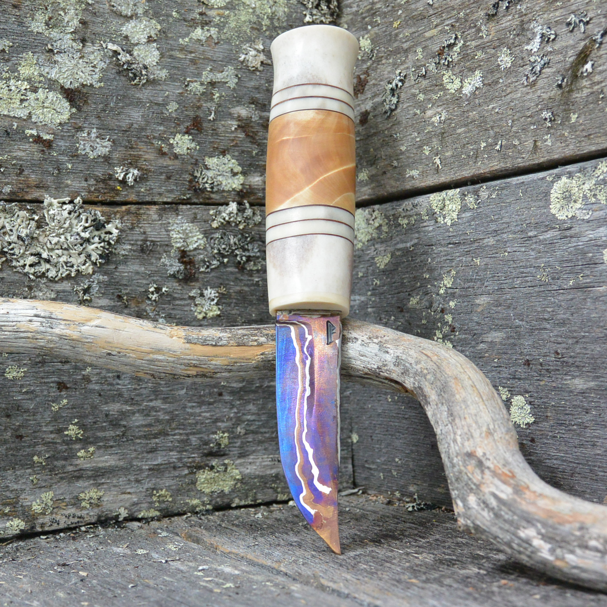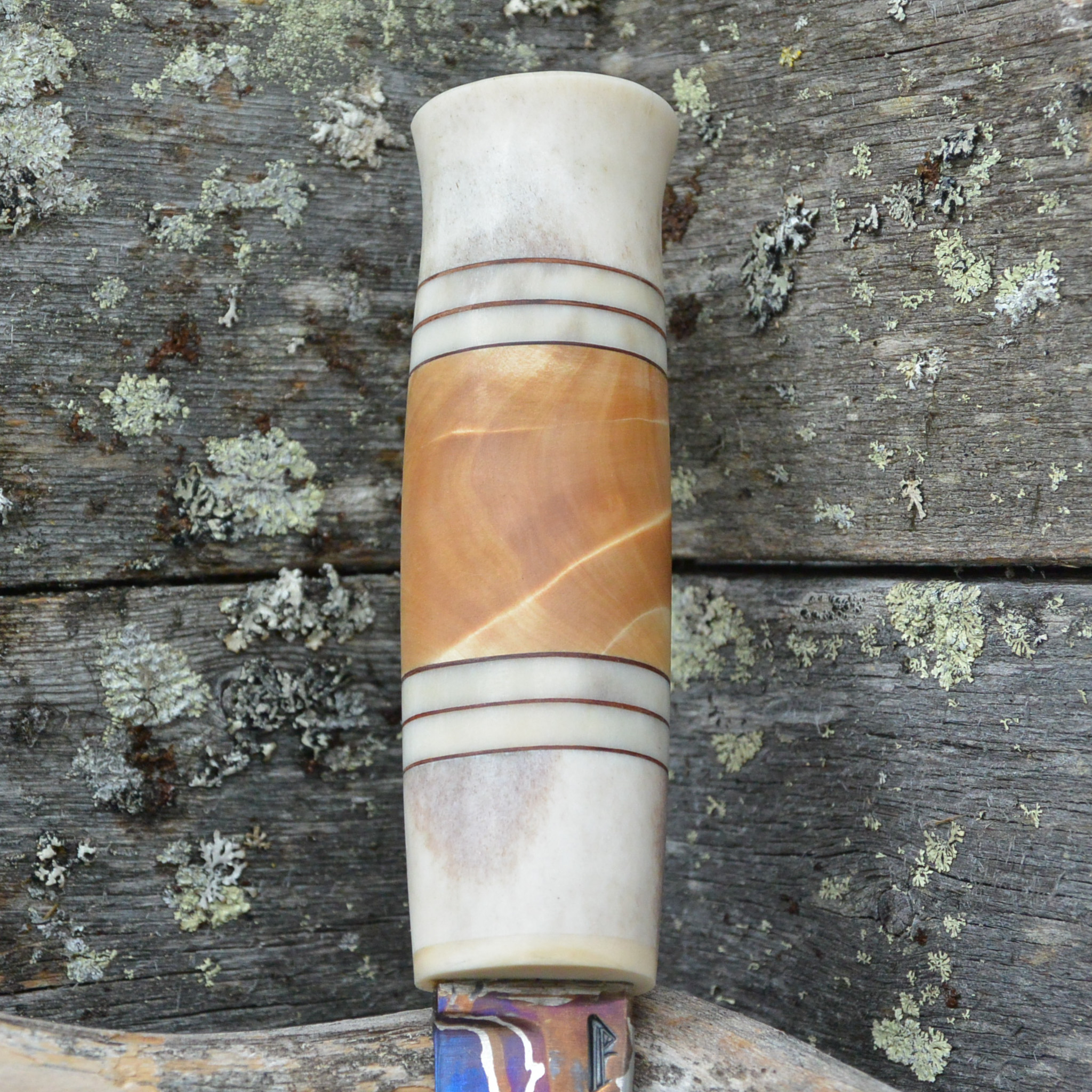 Kahva: helat ja välilevyt poronsarvea, väleissä sisnaa, keskellä koivunpahkaa