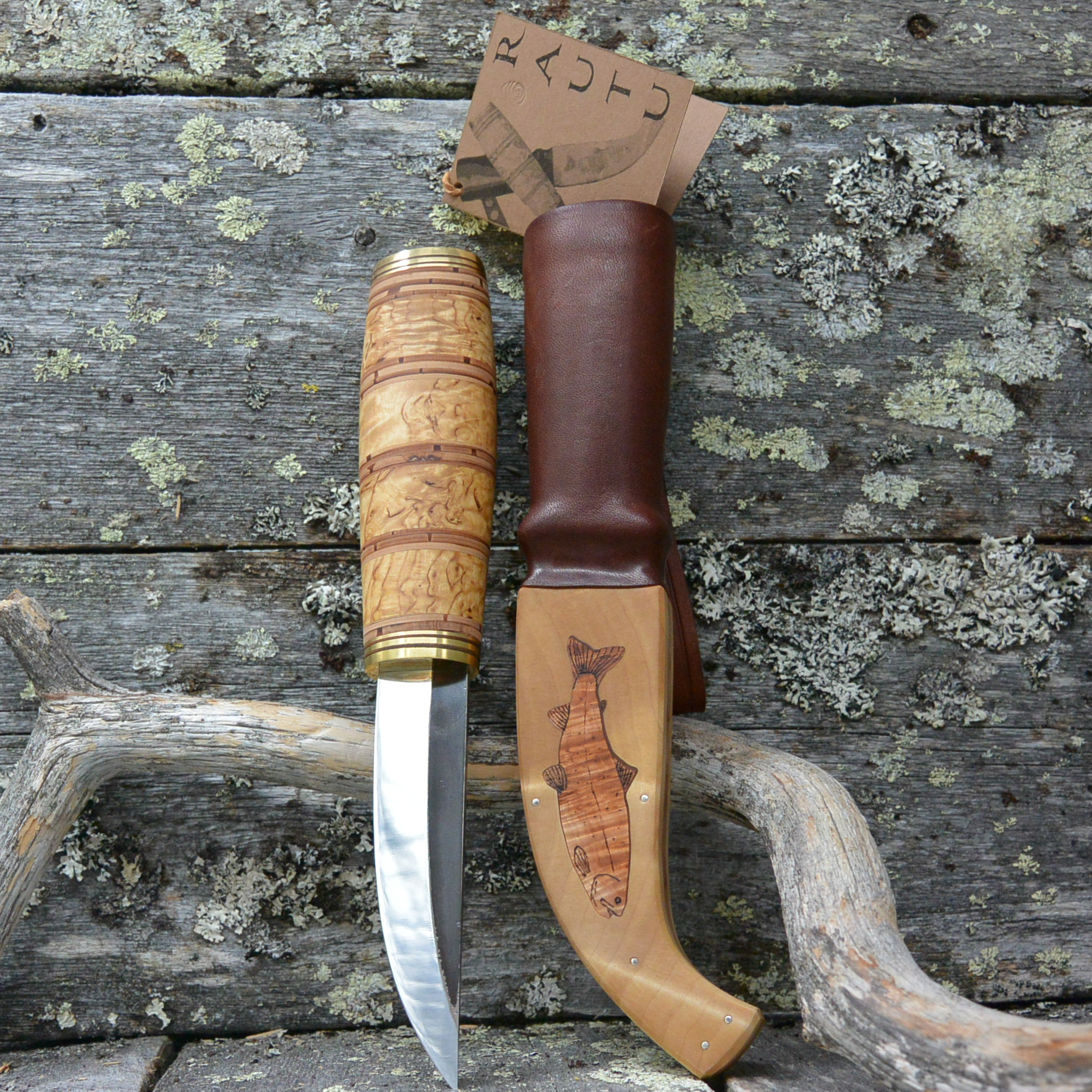 Hoito: käsinpesu. Älä laita puukkoa märkänä tuppeen.