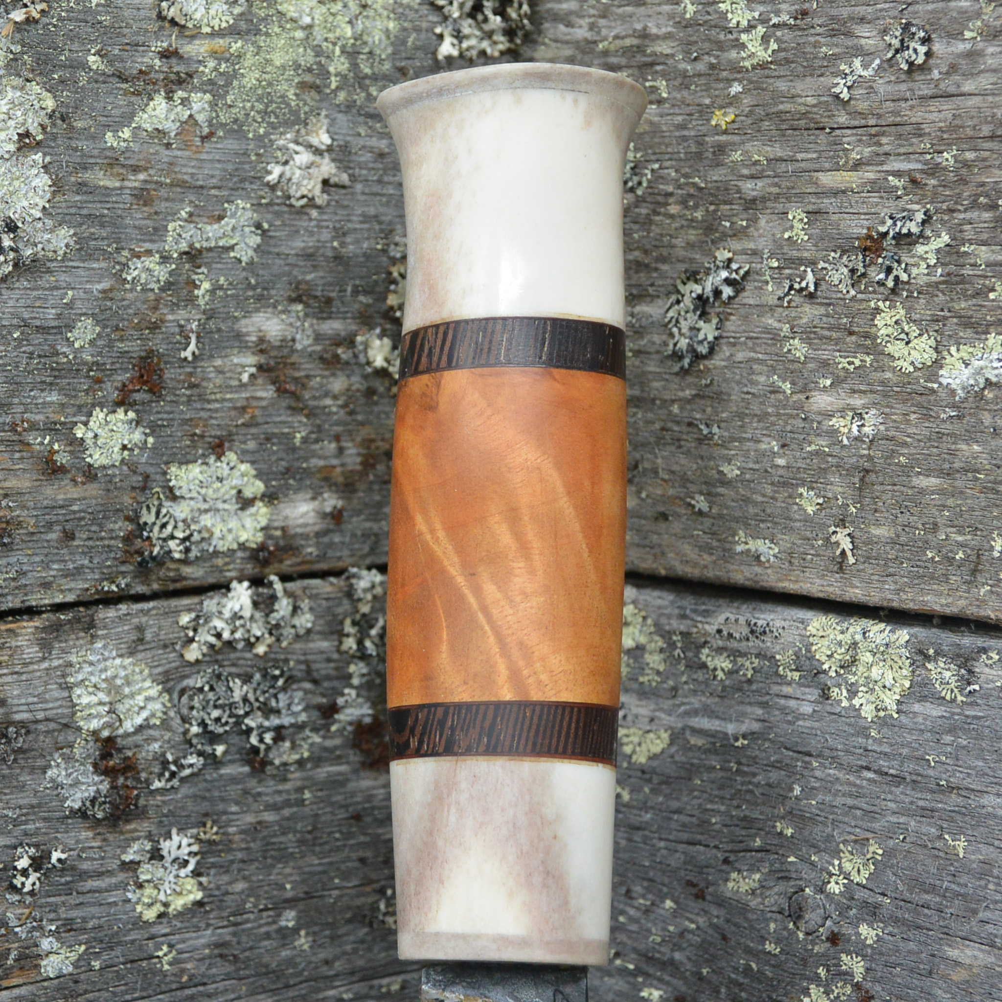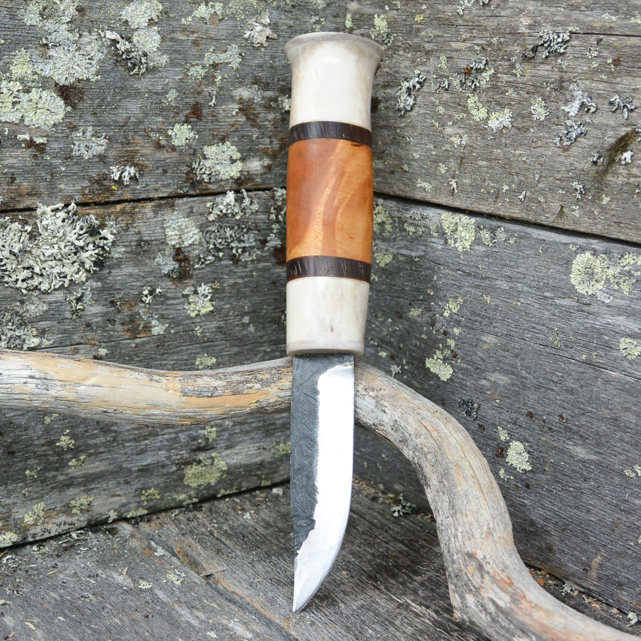 Kahva: helat poronsarvi, keskellä koivunpahkaa ja ebonypalat, väleissä sisnaa