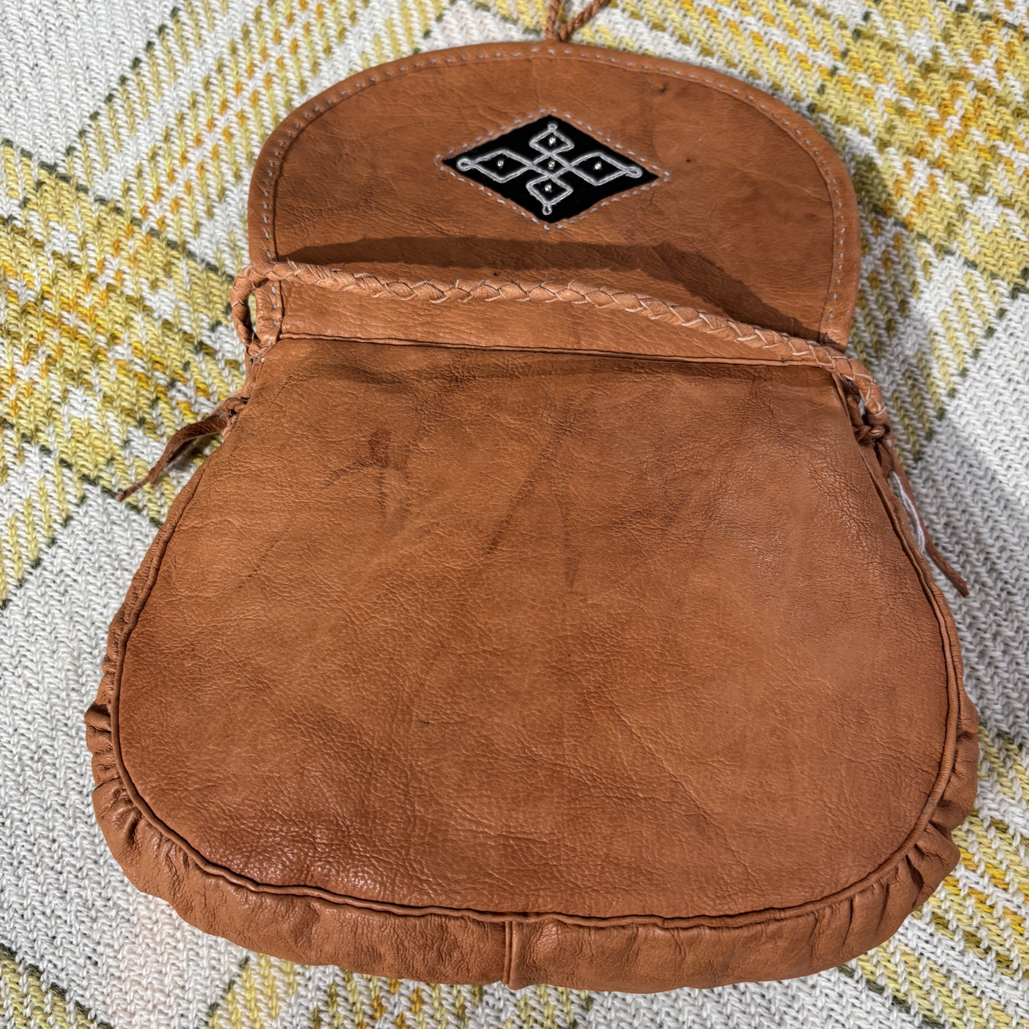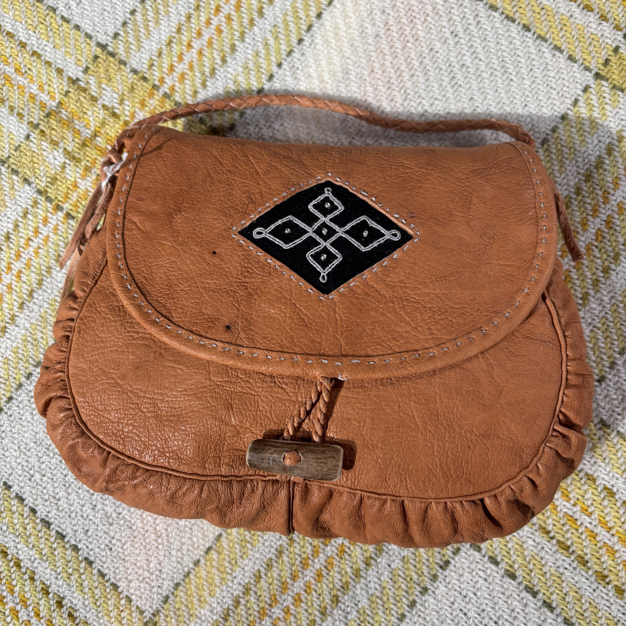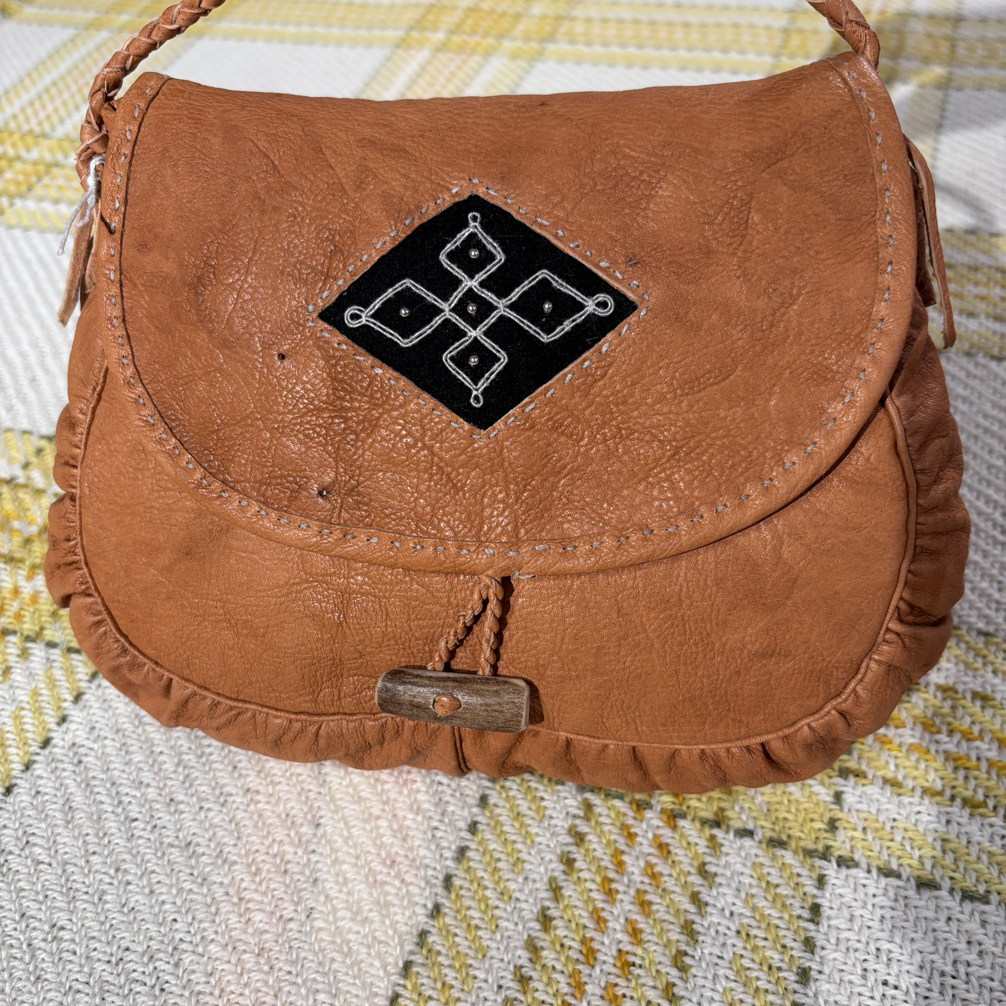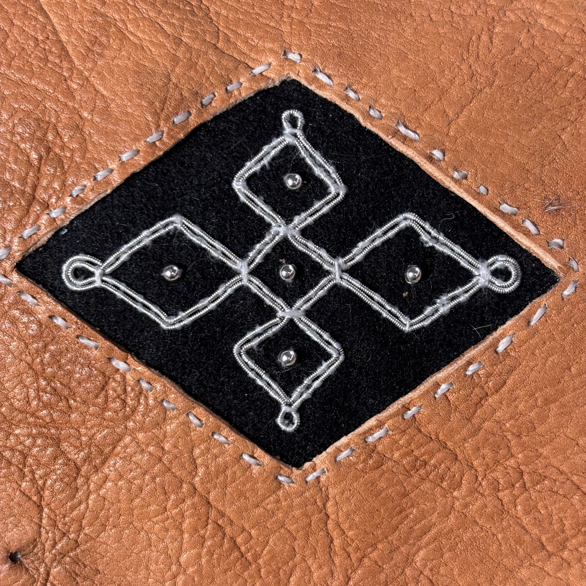 Olga Kangasniemi on inarilainen käsityöläinen. Laukut ovat käsintehty, ne ovat itse valmistettua sisnanahkaa, myös sarvinapit ovat itsetehdyt. Laukussa uniikki tinalankakoristelu.