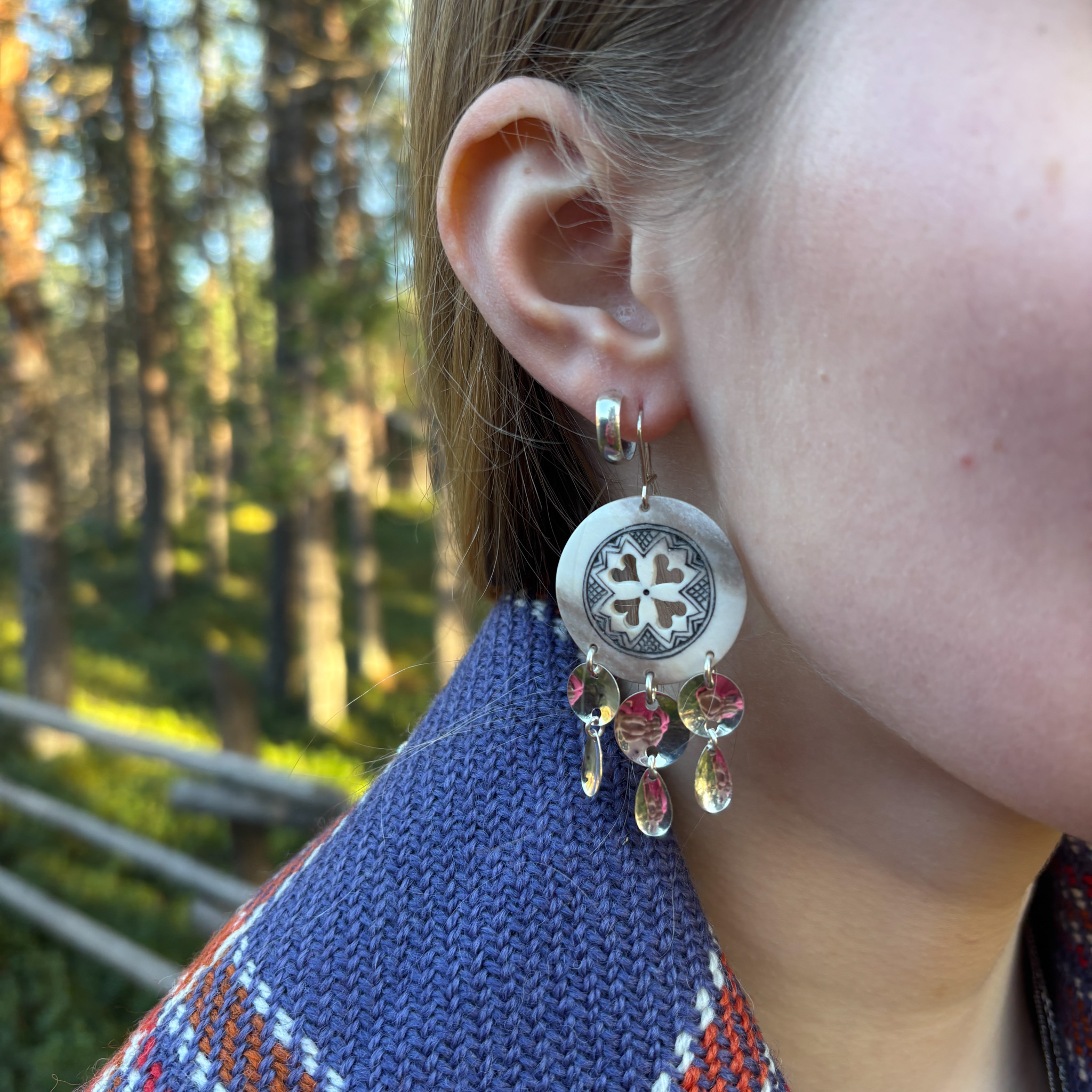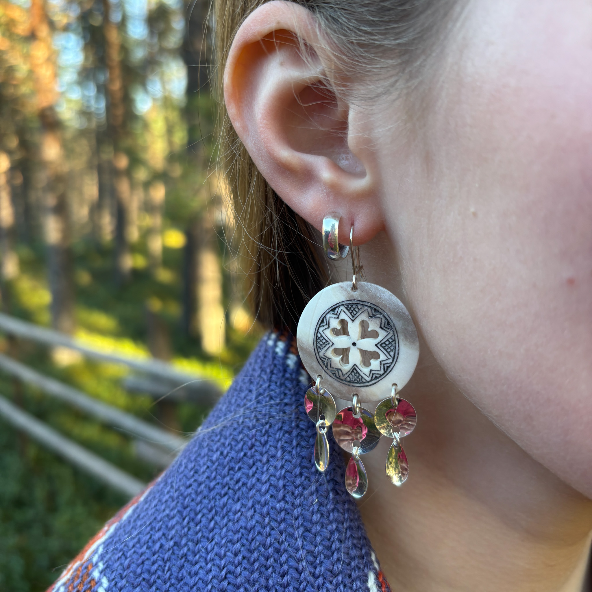 Taidokkaasti duojari (saamenkäsityöläinen) Ilmari Tapiolan kaivertamat poronluiset korvakorut hopeisilla laukkasilla. Korvakoruissa neljä sydämenmuotoista reikää, jotka ovat käsityöläisen kädenjäljelle ominaista tavaramerkkiä. Luisen korun koko on noin 3 cm. Kokonaispituus korviksella on noin 6,5 cm.
