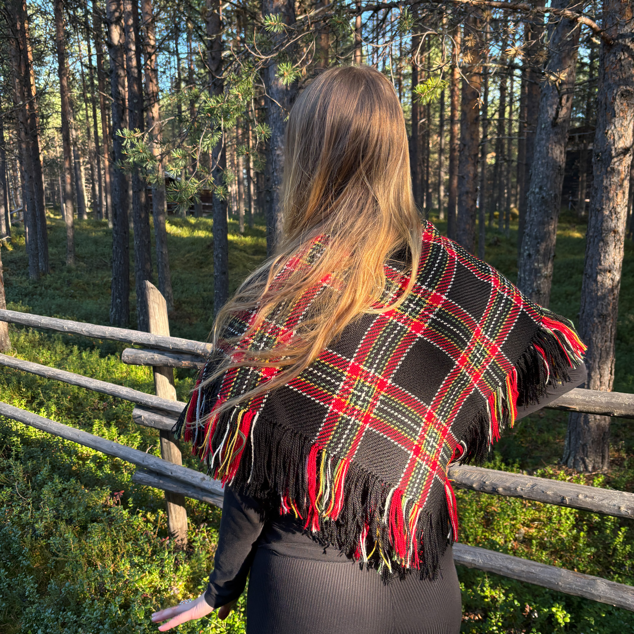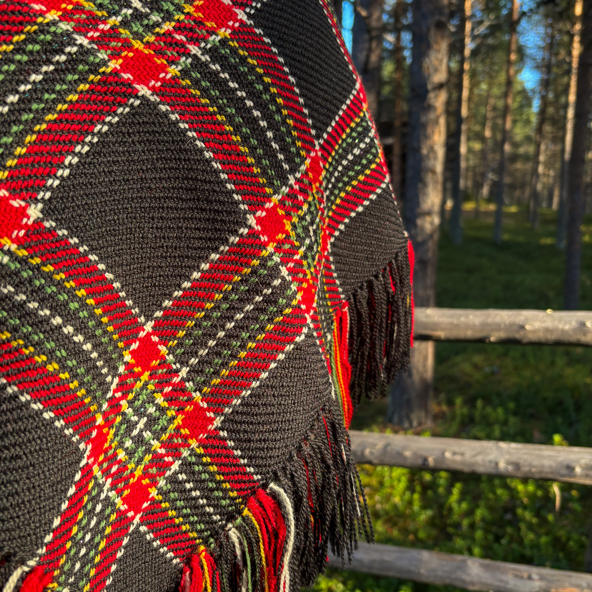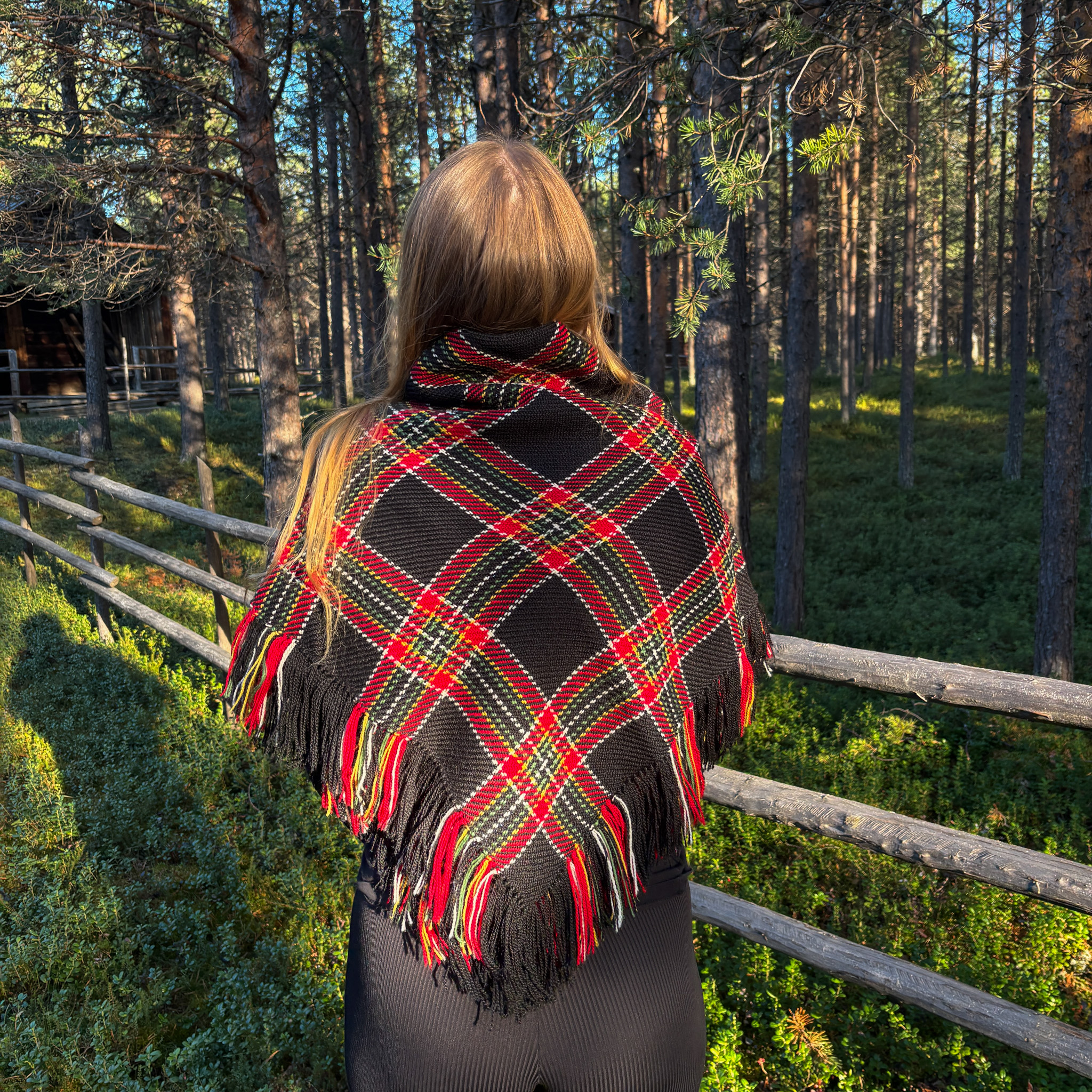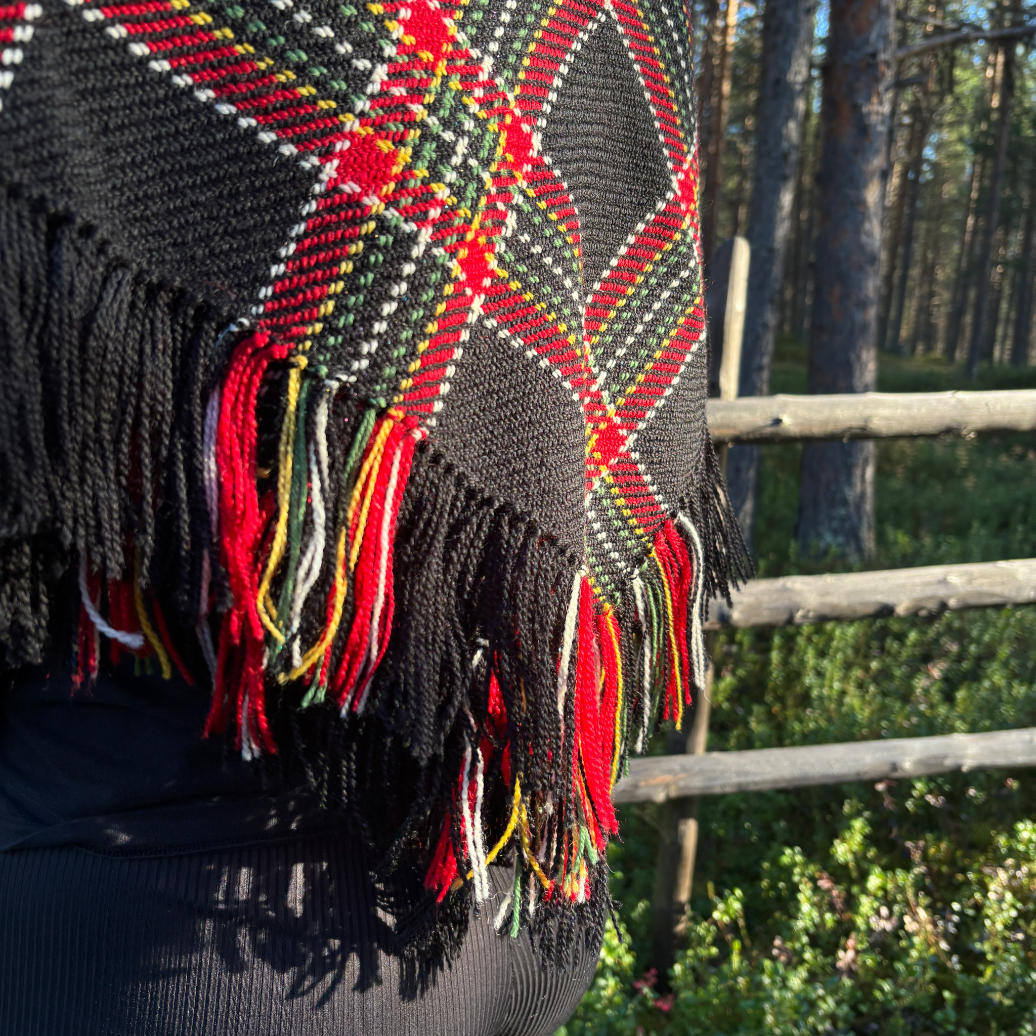 Mustapohjainen villahuvi värikkäillä yksityiskohdilla. Huivin on kutonut Ellen Haarahiltunen kotonaan, Inarissa.